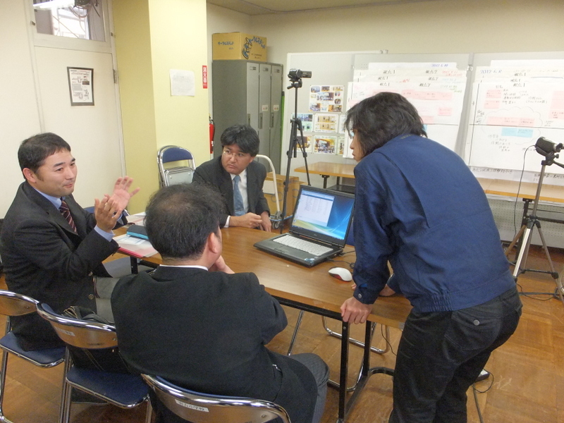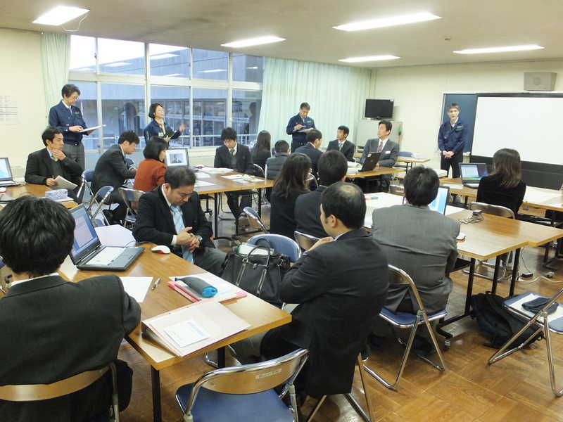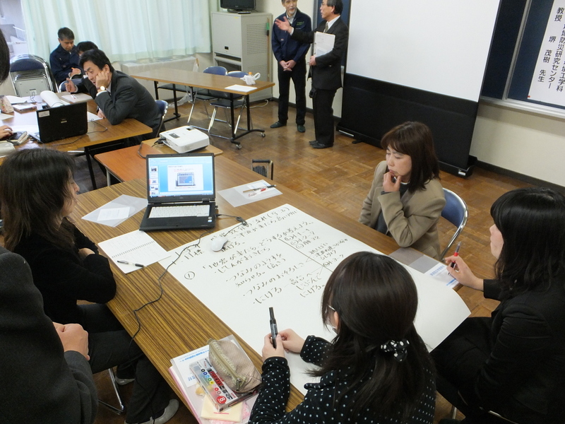 参加者は、宮古市内の小学校教員の約30名、教育委員会および地域防災研究センターの職員です。はじめに、堺センター長からは津波の基礎知識と東日本大震災の津波被害を紹介し、続いて小学校の先生方には6グループに分かれて1年生~6年生を対象とした教材作りにチャレンジして頂きました。その後、できたところまでのグループ別発表会を行いました。地域防災センターからは教育学部の兼務教員も参加しており、小学校教員の方へアドバイスやコメントなどを行いました。