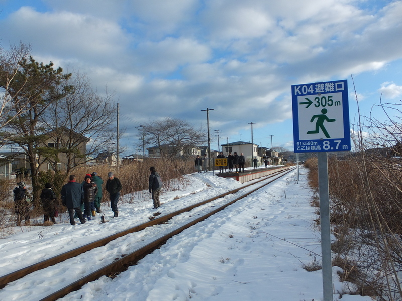 今回は、東日本大震災の時に発生した津波数値計算のアニメーションを始めに紹介し、当時の津波の状況を振り返って貰いました。その後、2グループに分かれてそれぞれの地域を約2時間かけて歩き回り、避難路や避難場所の確認、整備状況を確認しました。