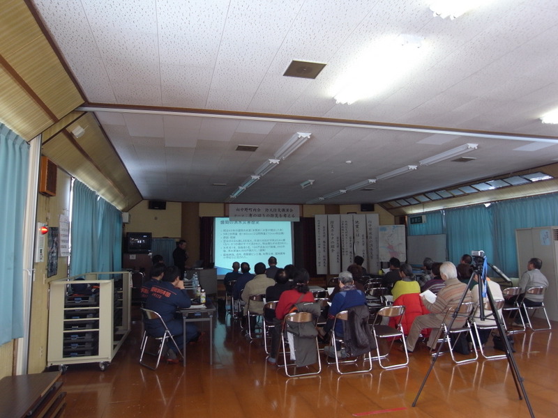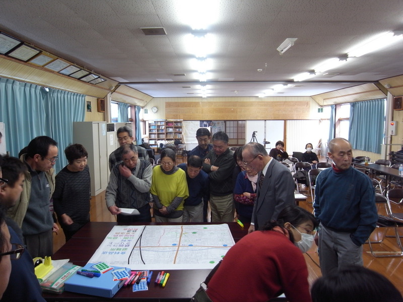 はじめに、今回の講演会を企画したリーダー育成プログラム修了生による同地区の洪水災害の歴史と対策に関する講演が行われ、その後、センター教員による地震動に関する講演と防災かるたの紹介、地図を使った図上訓練の紹介を行いました。図上訓練の紹介では、講演を聞きに来た人たちに災害時の危険個所や食料品店の場所を挙げて地図に書き込んでもらい、短い時間でしたが、災害時を考えた意見交換が活発に行われて、盛り上がりました。