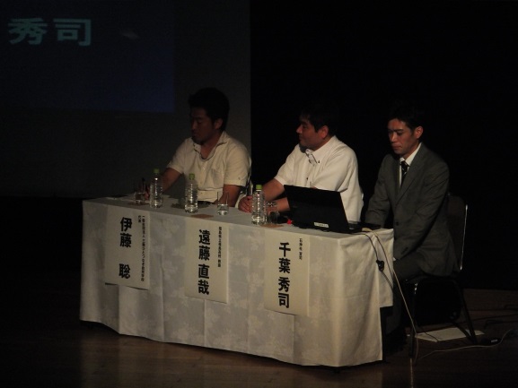 東日本大震災の復旧・復興に貢献した人(団体)を顕彰する「東北みらい賞」には、伊藤聡氏(一般社団法人三陸ひとつなぎ自然学校代表)・遠藤直哉氏(福島県立福島高校教諭)・千葉秀司氏(石神社宮司)が受賞され、パネルディスカッションでは各受賞者のこれまでの活動を紹介して頂きました。その後、活動報告として「東日本大震災における学生ボランティアの復興支援」と「遠野市の“ぬくもり“を活用したみらい創り活動」が紹介されました。
