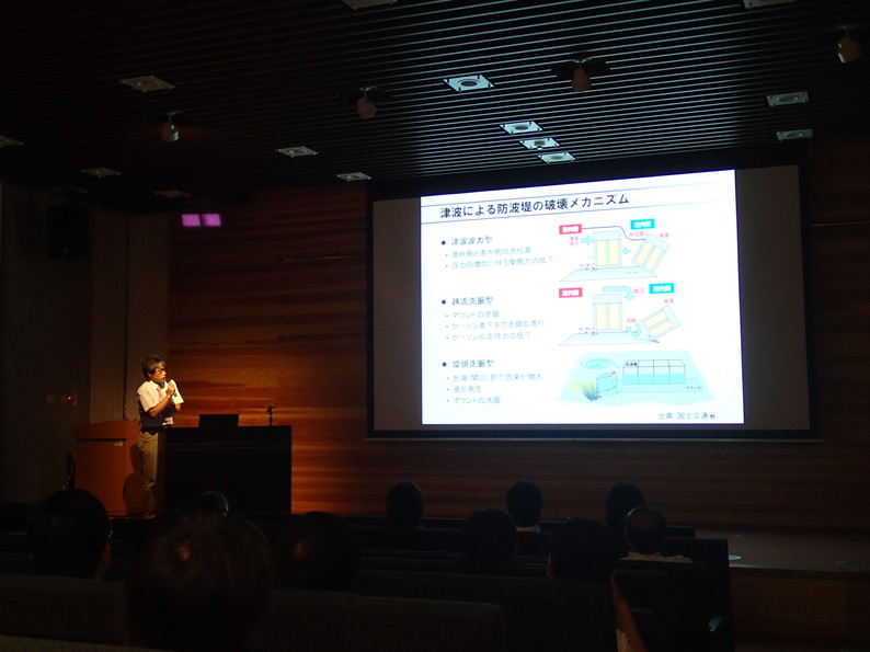 副センター長の司会で、センター長の講演に始まり、3部門(自然災害解析、防災まちづくり、災害文化)の各部門長からの概要説明と担当教員による個別成果を紹介しました。当日はデジカメなどで講演スライドを撮影する聴講者も多かったため、参加者が強い関心を持っていることがうかがえました。