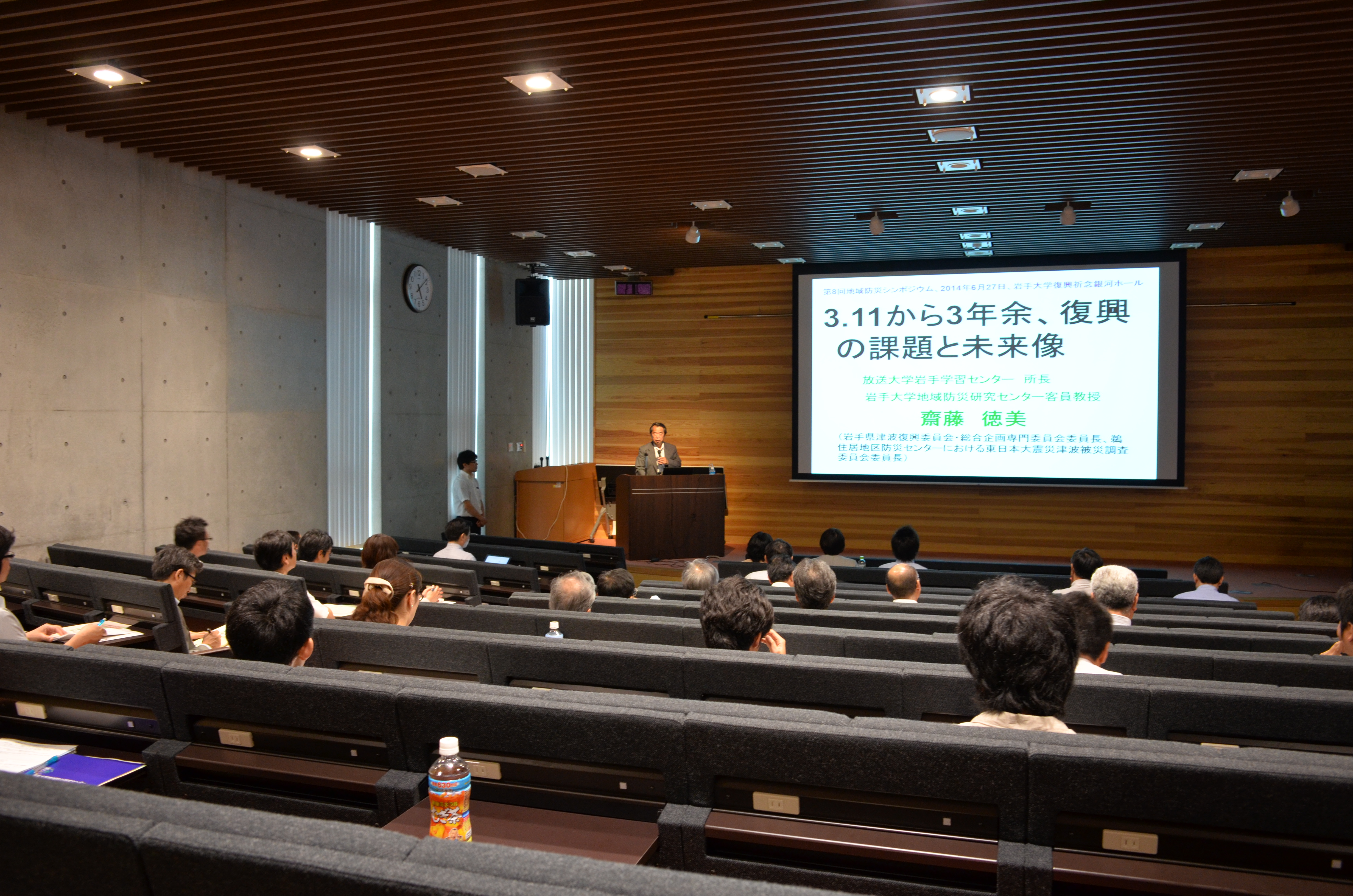 平成26年6月27日、岩手大学復興祈念銀河ホールにおいて、第8回地域防災フォーラムが開催されました。今回は、平成25年度の成果報告会と講演会が行われ、一般市民・学生など約70人の参加がありました。