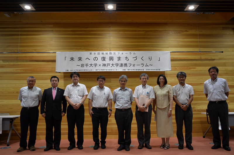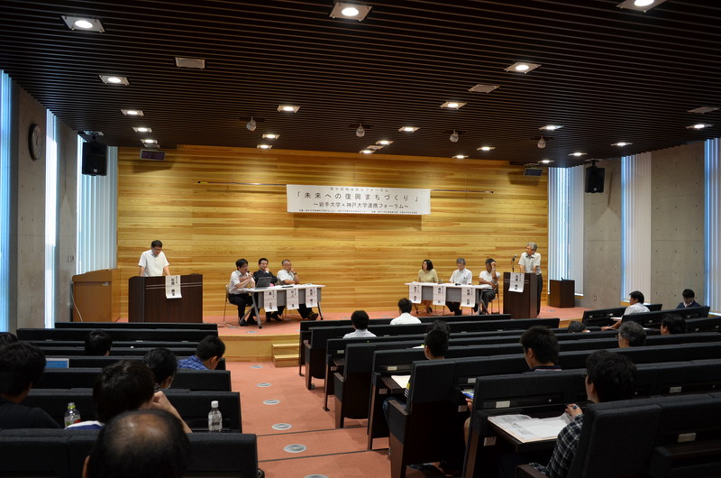 第9回地域防災フォーラムは、東日本大震災から3年を経た被災地が抱える課題について、神戸大学と連携し阪神淡路大震災からの復興の知見を踏まえ、来年3月に開催される国連防災会議を視野に入れつつ、未来志向の復興まちづくりについて討議を行いました。岩手大学からは、復興のまちづくりについてのこれまでの取り組みの一般的紹介に続き、実践的危機管理、人材育成、市民の意思による自己実現のまちづくりについて研究発表がなされました。神戸大学からは、地域特性を考慮した持続的復興の問題点、災害の記憶を歴史上切断しない重要性、復興の担い手に焦点を当てたコミュニティ再生の意義について知見が示されました。70名の市民及び学生が集い、総合討論でも活発な議論が交わされました。復興の過程において課題は多くありますが、希望をつなぐ復興まちづくりのために、参加者一同、地域や住民に寄り添いながら活動を推進していく方向性を確認し、閉会いたしました。