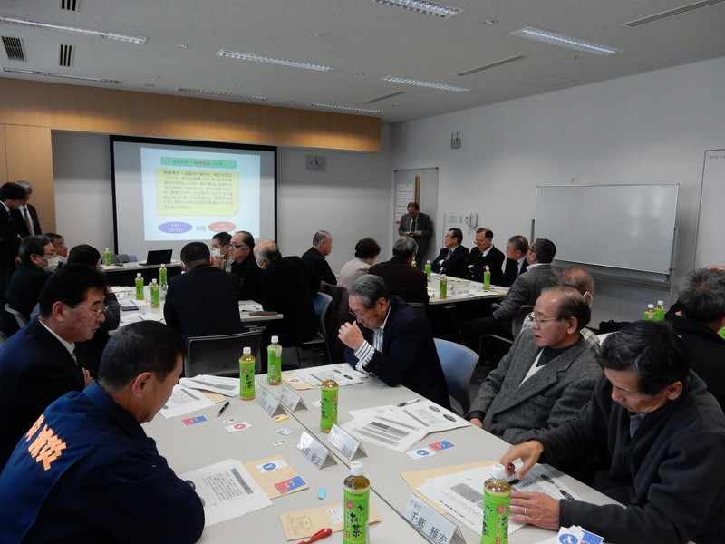 講義・演習は菊池義浩特任助教と佐藤悦子特任助教が担当し、午前に行なわれた地域防災サポーター研修会では、地域防災サポーターに対しクロスロード(Crossroad,災害対応カードゲーム)を行い、災害時における自らの判断・行動を考え、各々の立場に基づく価値観の違いを認識・共有を図るとともに、演習の体験を通じて、その手法・考え方について習得してもらいました。午後からの自主防災組織連絡会議では、まず自主防災組織の活動をテーマに話題提供を行い、それと同時進行で活動実態や連携状況などの情報交換を行いました。続いて、自主防災組織リーダーおよび自主防災組織担当職員に対して行なったクロスロードでは、地域防災サポーターが午前中の研修の成果を早速実践し、演習のサブ進行役となって、参加者による積極的な意見交換に一役買っていました。