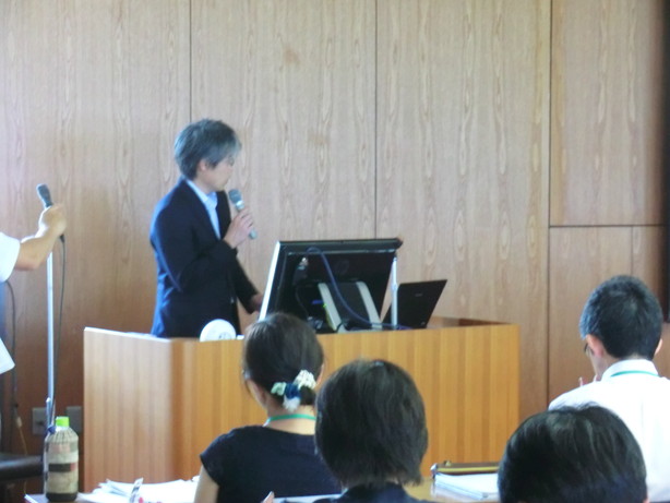 小笠原准教授からは、「防災教育教材を活用した授業づくり-大雨・洪水編-」と題して、教材DVDの構成や作成に取りかかった背景および本教材の特徴について説明を行いました。