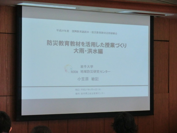 岩手県教育委員会主催により、岩手県内の小・中学校および特別支援学校の教員約80名を対象として、平成25~26年度にかけて岩手県と共同で作成した防災教育教材DVD-地震・津波編-と,-大雨・洪水編- を用いた授業づくりに関する講義と演習が開催されました。この研修会に、地域防災研究センターからは作成に関わった教員3名が参加しました。本講義および演習は、平成26年5月に岩手県から配布された復興教育副読本の教育的価値「いきる」「かかわる」「そなえる」のうち、「そなえる」を具現化するための活動で、授業での効率的な活用方法についての研修を行い、復興教育の充実を図るために行われたものです。