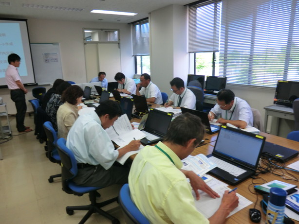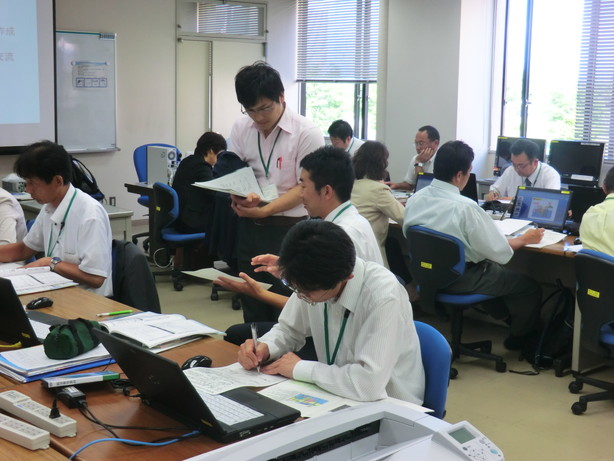 その後の演習では、はじめに防災教育教材DVDの内容の概説や演習の流れについての説明が行われた後、教材を活用した授業づくりの構成や素材の選択を各先生方に実施してもらいました。その後、各先生が作成した授業展開案をお互いに発表し合い、代表者によるプレゼンテーションと全体討議を行いました。