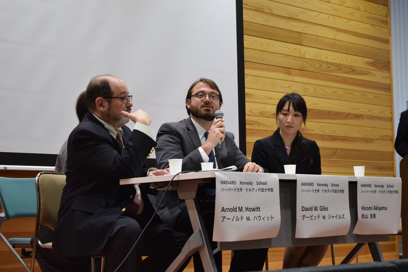 後半は、岩手大学地域防災研究センターの松岡勝実教授がコーディネーターを務め、ハーバード大学ケネディ政治大学院のデービッド・ジャイルズ氏、秋山浩美氏にも登壇いただき、フロアとの質疑応答・意見交換を行いました。まず、越野修三教授および村上清客員教授が被災地における経験から論点を提示し、その内容を踏まえつつ、広く来場者と地域防災への展開に向けた議論を深めました。