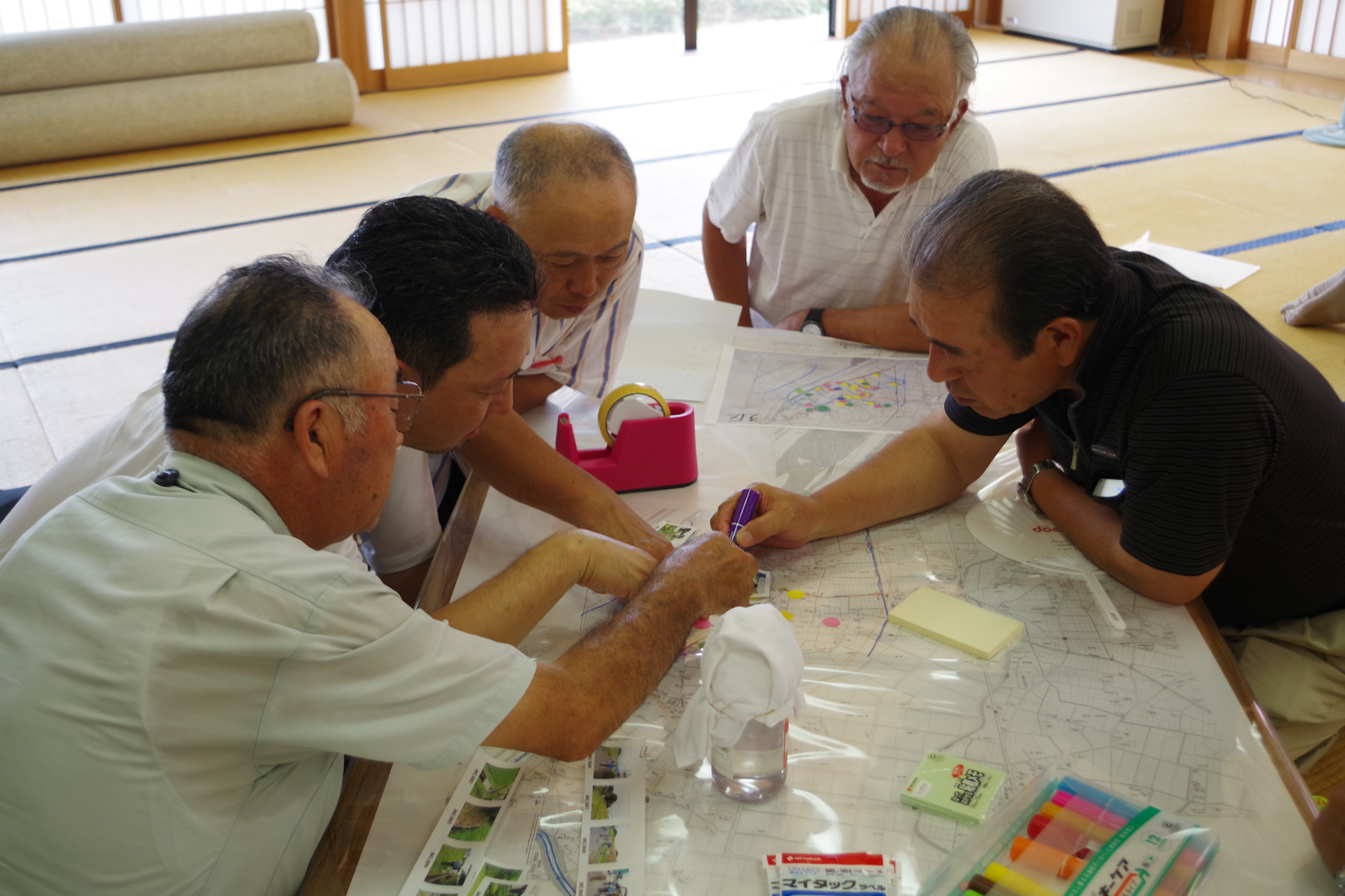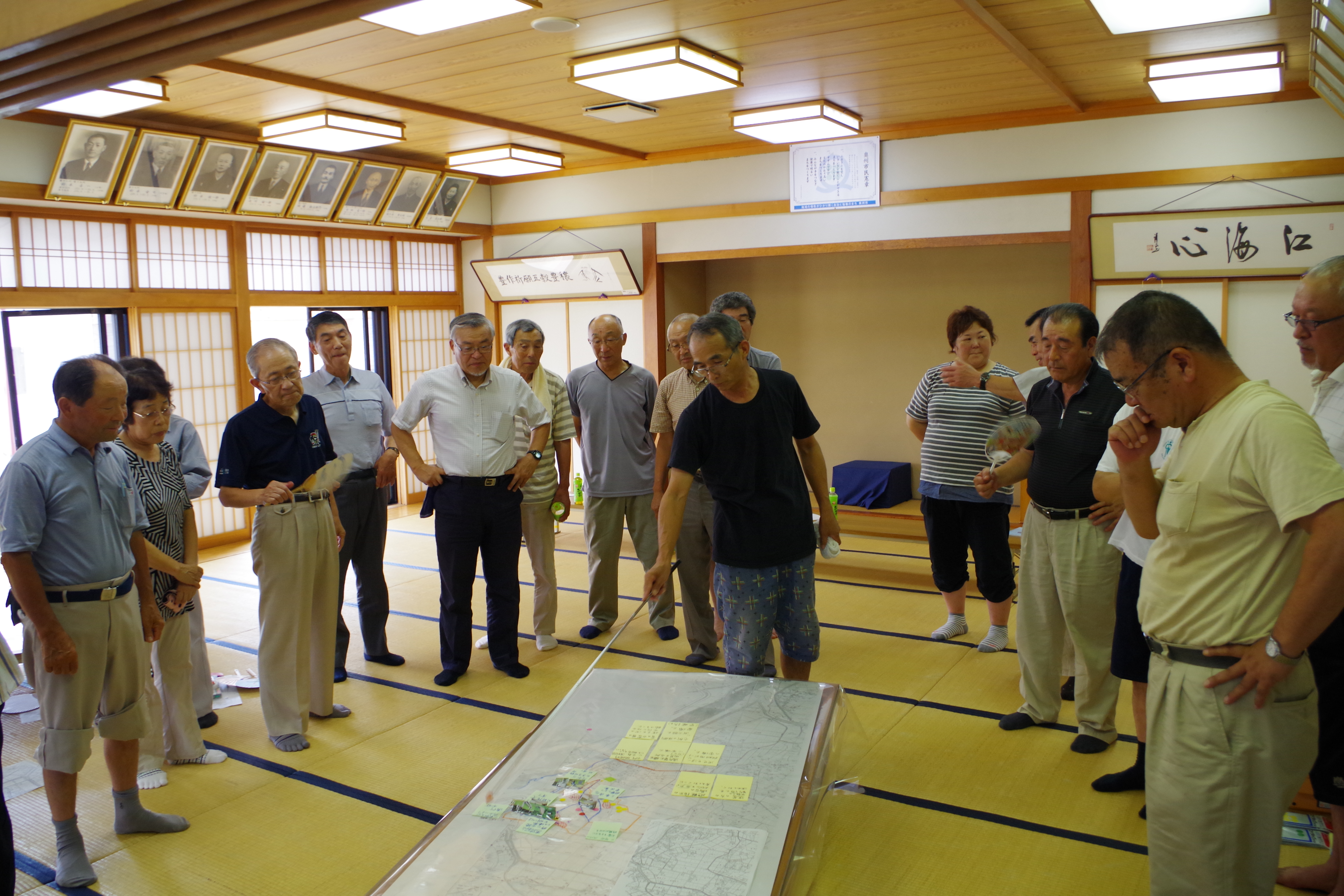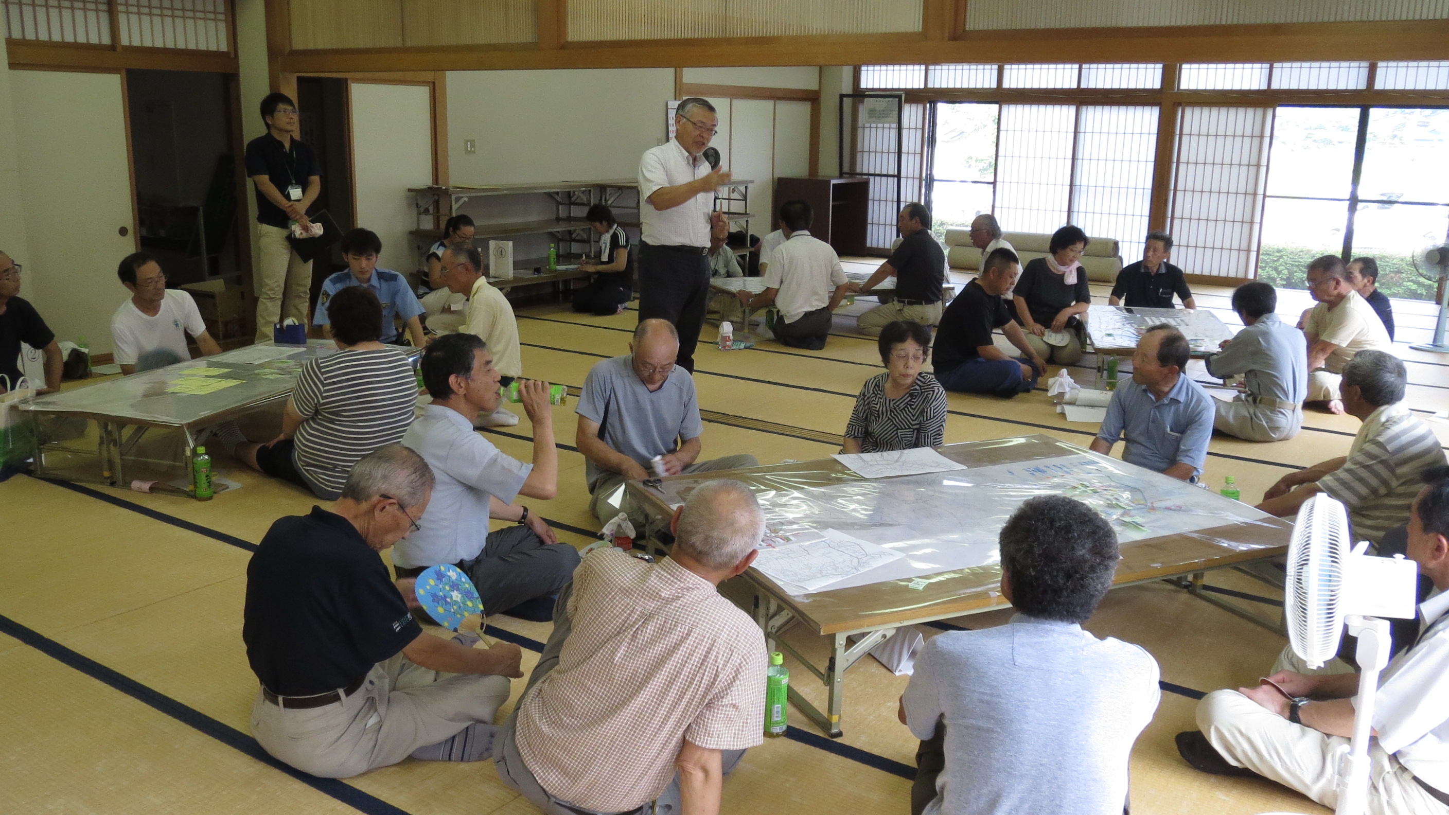 奥州市前沢区白山地区では、まちおこしの一環として自主防災力の強化に取り組んでいます。2011年3月に自主防災会を立ち上げ、これまでにもさまざまな自主防災訓練を行ってきました。今回は、2015年6月に行われた町歩きの成果を踏まえ、行政区ごとの住民による防災マップ作成に取り組みました。岩手大学地域防災研究センターからは越野修三教授ら4名が防災マップ作成を支援するという形で参加しました。防災マップを作成する中で、各行政区の災害時の危険箇所や新たな課題が浮き彫りになり、今後さらに活動を推進していくことになりました。終了後、越野教授は、「今回の防災マップ作成ははじまりにすぎない。地域全体でこのマップをいかにして共有し、行動に移していくかが重要である。よりいっそう自主防災力の強化に向けて取り組んで頂きたい」と講評を述べました。