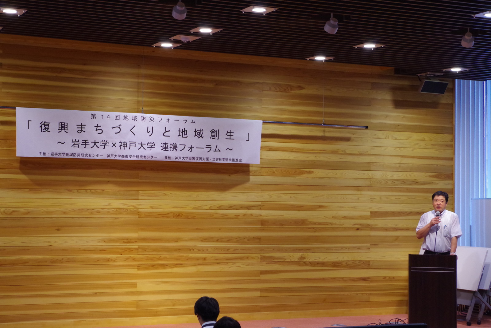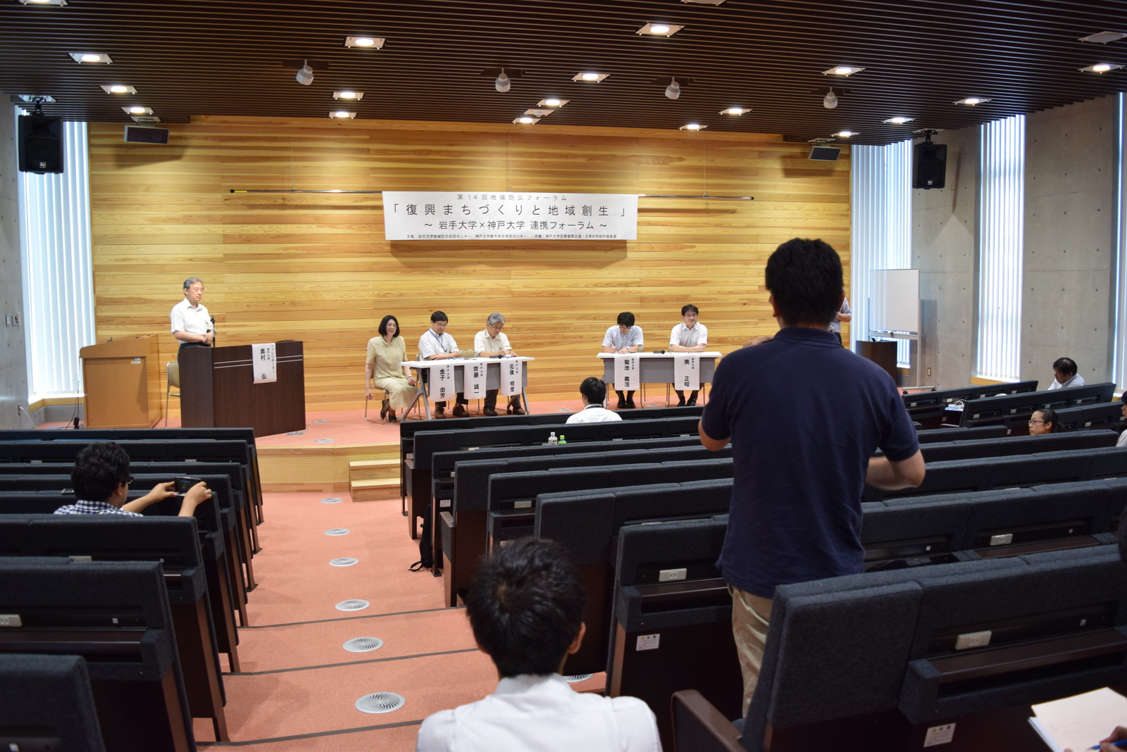 第14回となる今回は、東日本大震災から4年を経た被災地が抱える課題について、神戸大学と連携し阪神・淡路大震災からの復興の知見を踏まえ、中・長期化する復興まちづくりについて「地域創生」をテーマに討議を行いました。開催あいさつの後、まず第1部として岩手大学から、地域防災研究センターの活動と震災復興・地域創生に向けた大学の役割、小中学校に着目した地域防災・地域再生の拠点形成に関する調査研究および活動の報告がありました。