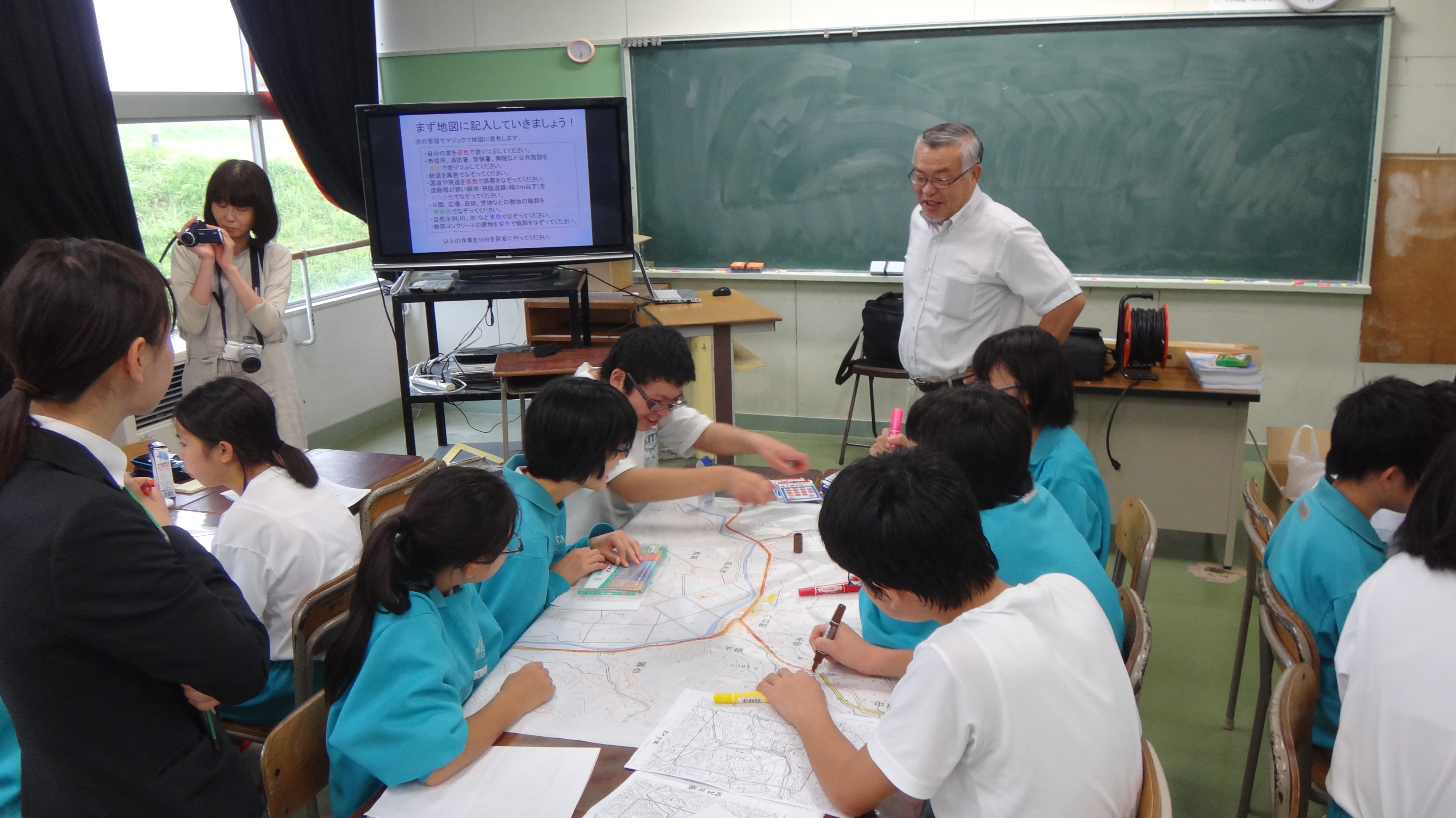 初日は、丑石小学校周辺と興田中学校周辺、中川小学校周辺の3つのグループに分かれ、DIG(Disaster Imagination Game:災害図上訓練)を実施しました。生徒たちは、避難所や危険箇所、災害時の物的・人的資源などを地図上に書き込み、自分たちが暮らす地域について防災上の強みや弱みを再認識する機会となりました。