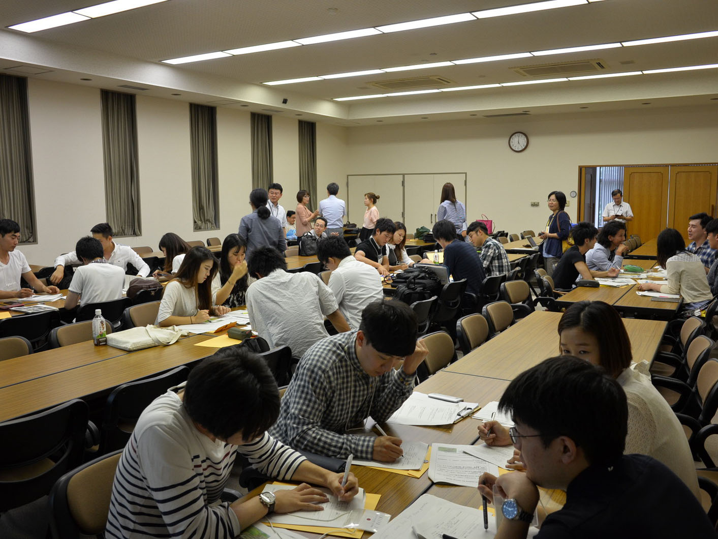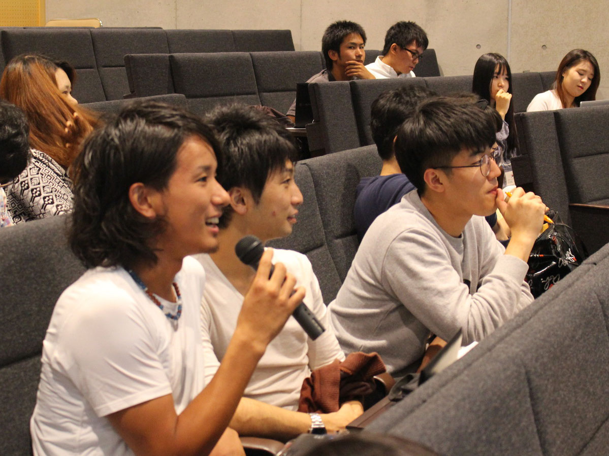 初日は大学紹介や学生の自己紹介が行なわれた後、研修プログラムの説明および両学の研究者によるミニ講義が行なわれました。地域防災研究センターからは、被災地の現状について菊池義浩特任助教による説明があり、研修テーマに関わる津波被害の実態および復興計画の概要などを解説しました。また、小林宏一郎准教授からは最近の研究課題について、災害時における見守りシステムの研究成果の紹介がありました。その後、事前に設定していた課題ごとにグループ分けが行なわれ、学生同士のグループ・ワークを開始しました。