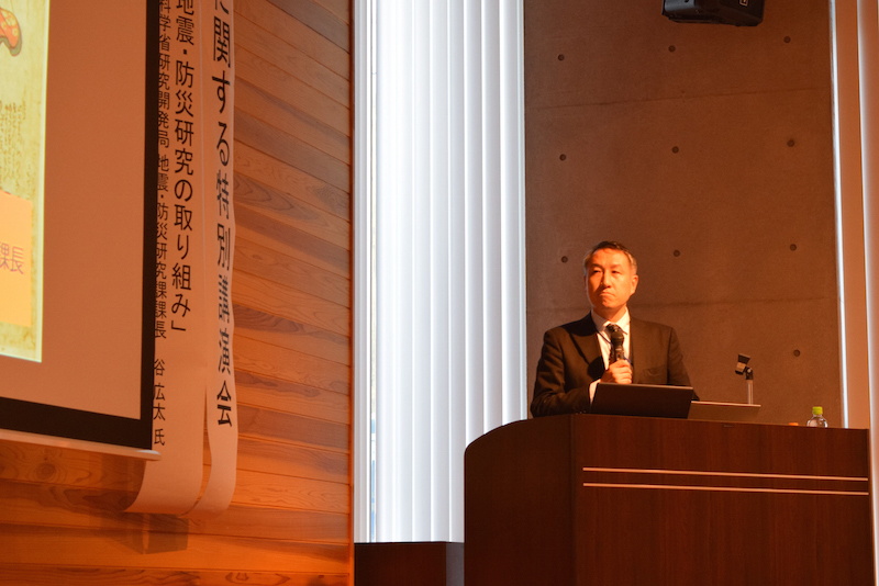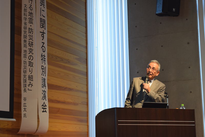 講演会は,越谷信副センター長の司会で進行し、はじめに岩渕明学長による開会挨拶がありました。続いて文部科学省研究開発局 地震・防災研究課課長 谷広太氏の特別講演では,地震・津波や極端気象災害に対する文科省の取組み事例の他に,次世代火山研究・人材育成総合プロジェクトや,都市の脆弱性が引き起こす激甚災害の軽減化プロジェクトなど,現在取り組んでいる事業についての紹介がありました。