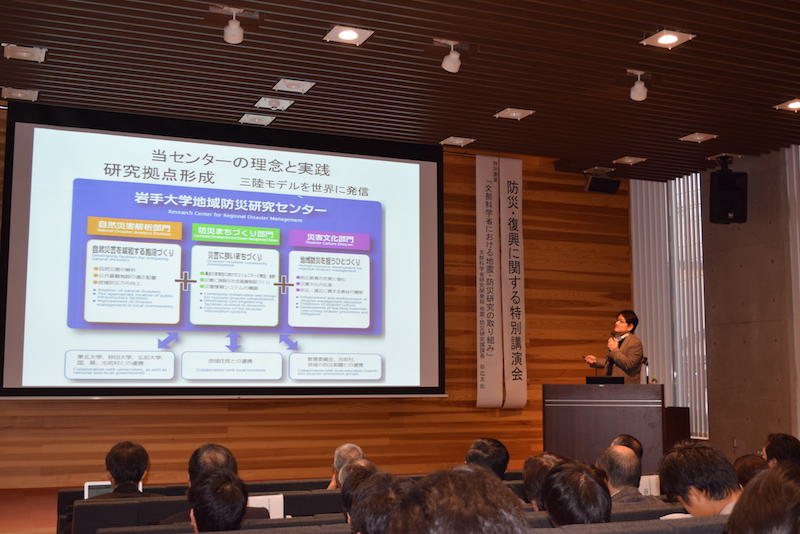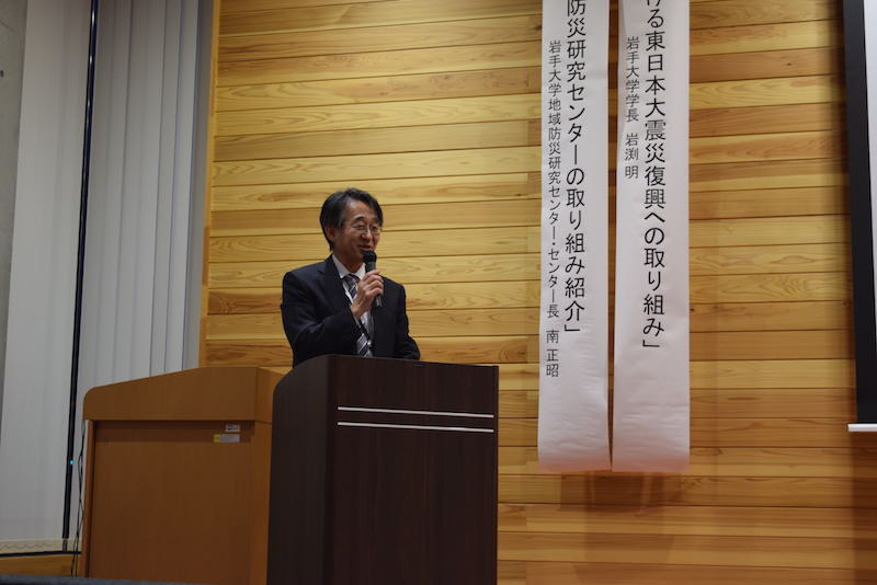 岩手大学における取り組み事例として,南正昭センター長より地域防災研究センターの取り組みについて紹介がありました。最後に,船崎健一工学部長の閉会の挨拶で特別講演会を閉じました。
