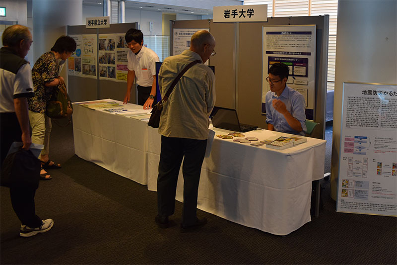 一般市民からの来場者も多数みられ、被災地の復興や自然災害の防災・減災に関するこれまで取り組みを紹介しました。センターが発行している地域防災フォーラム講演録、宮古市立田老第一中学校 津波体験作文集「いのち」(山崎友子教授・災害文化部門長)を手に取られる方や、地震防災かるた(山本英和准教授・自然災害解析部門)に興味を持たれる方も多く、調査研究および実践活動の成果について地域社会に還元・普及していく機会となりました。