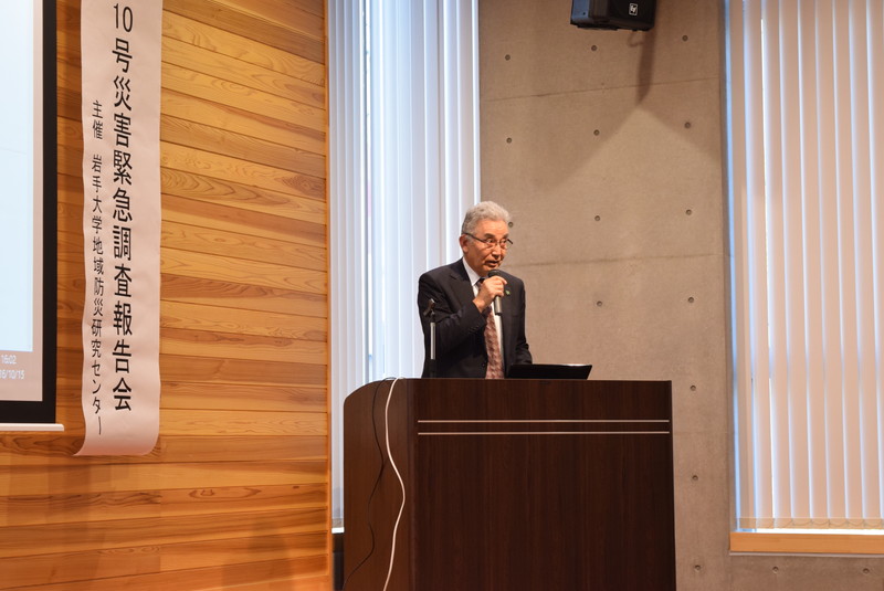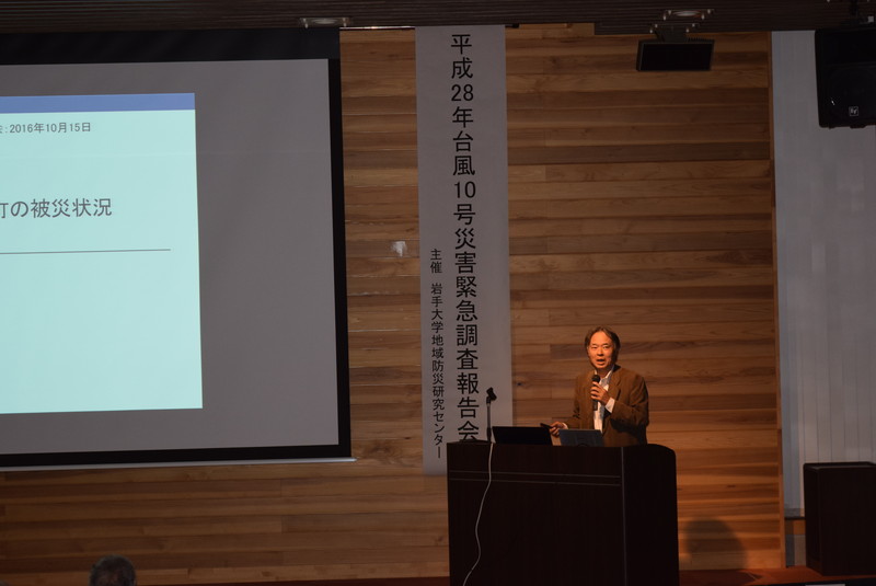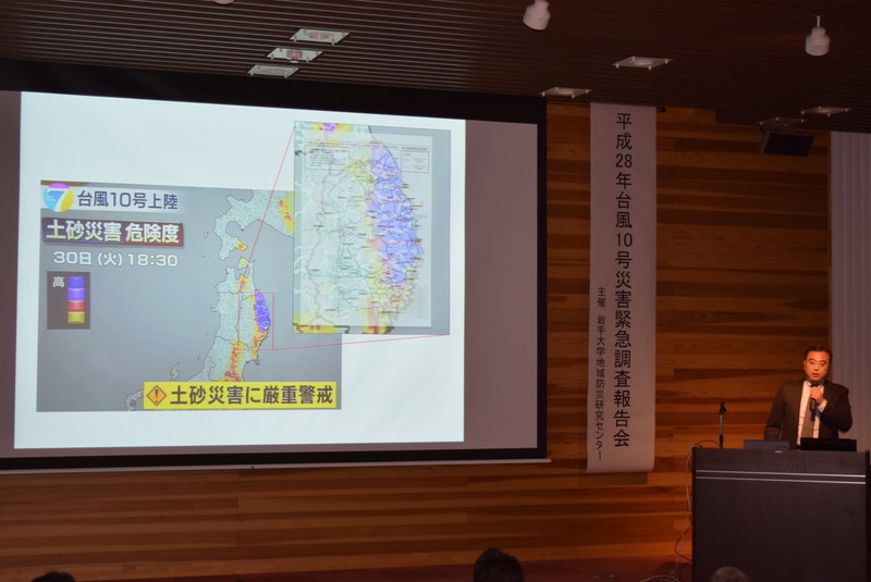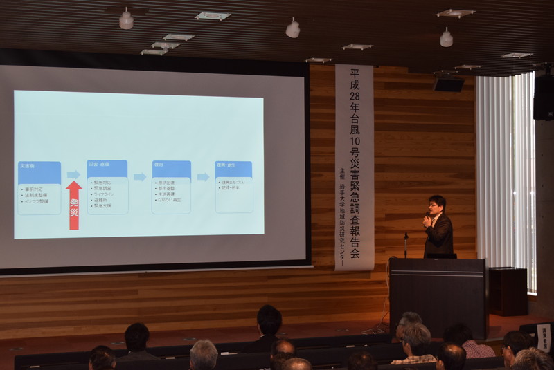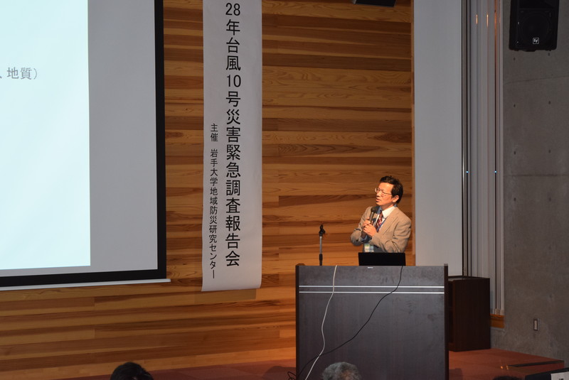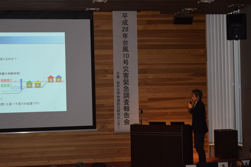 平成28年8月に発生した台風10号による被害を受け、岩手大学では発災直後から地域防災研究センター所属の教員らにより、被害状況等の調査に取り組んできました。今回の緊急調査報告会では、それらの調査結果の概括について報告するとともに、来場者との質疑応答を行いました。当日は会場の復興祈念銀河ホール(定員:120名)が満員になり、メディアによる取材も多数みられました。