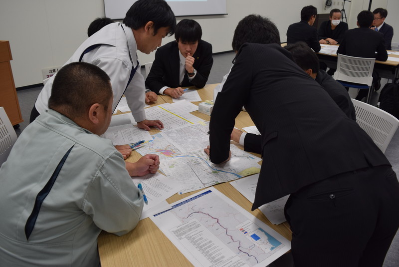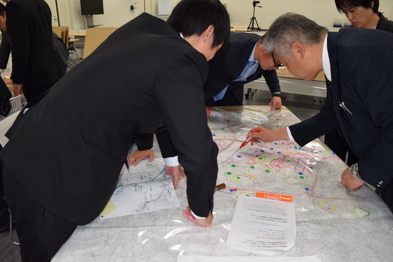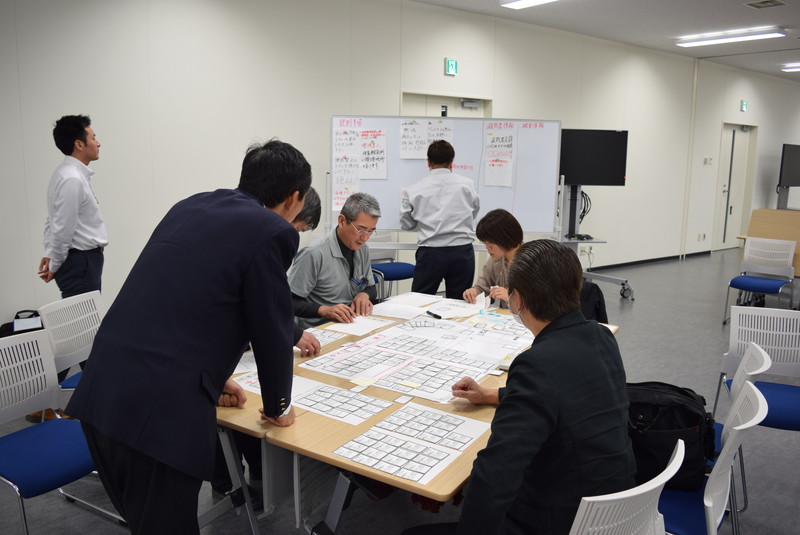 初日は、はじめに図上訓練の手法や効果などの解説があり、災害時のイメージアップと防災へのモチベーションの向上を図るクロスロード(災害対応カードゲーム)と、地域の災害特性とその対応策を検討するDIG(ディグ,災害想像ゲーム)を行いました。2日目は、静岡県が開発した避難所運営をゲーム感覚で模擬体験できるHUG(避難所運営ゲーム)と、個人や集団の動きをシミュレートし、その対応から課題等を抽出できるMM(マップ・マヌーバー)を実施しました。普段はあまり経験のない机上での訓練と、災害時における自分たちの対応だけでなく、各機関がどのような判断・行動を行っているのかを理解し、意見交換を図る機会にもなりました。