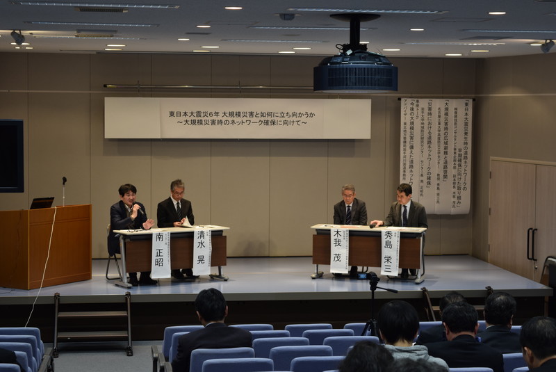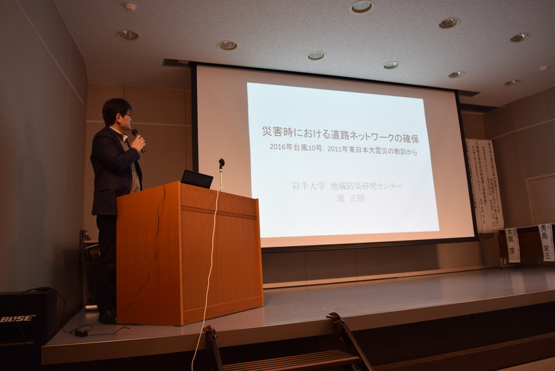 基調講演では、東日本大震災当時に東北地方整備局道路部道路管理課長として対応されていた木我茂氏と、南海トラフ地震対策中部圏戦略会議委員の秀島栄三氏を講演者にお招きし、3.11で実際に行われた道路啓開の作業フローと現場で求められる判断、また、台風・大雨災害における広域避難の可能性と実現に向けた対策などについてお話しいただきました。南正昭センター長からは、台風10号による道路網への影響と、避難計画の再検討に基づいた震災復興事業における効果の検証について問題提起がありました。
