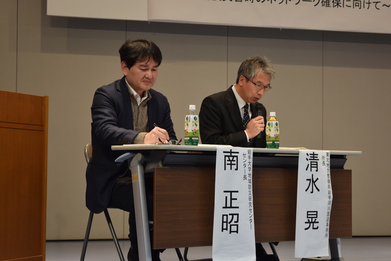 後半の車座トークでは、東北地方整備局岩手河川国道事務所長の清水晃氏をアドバイザーに加え、近年における大規模災害の経験を踏まえた、今後の道路ネットワークのあり方についてディスカッションを行いました。会場からも意見や質問があげられ、社会的なネットワークの構築も見通しながら、今後の災害対応について検討していく機会となりました。