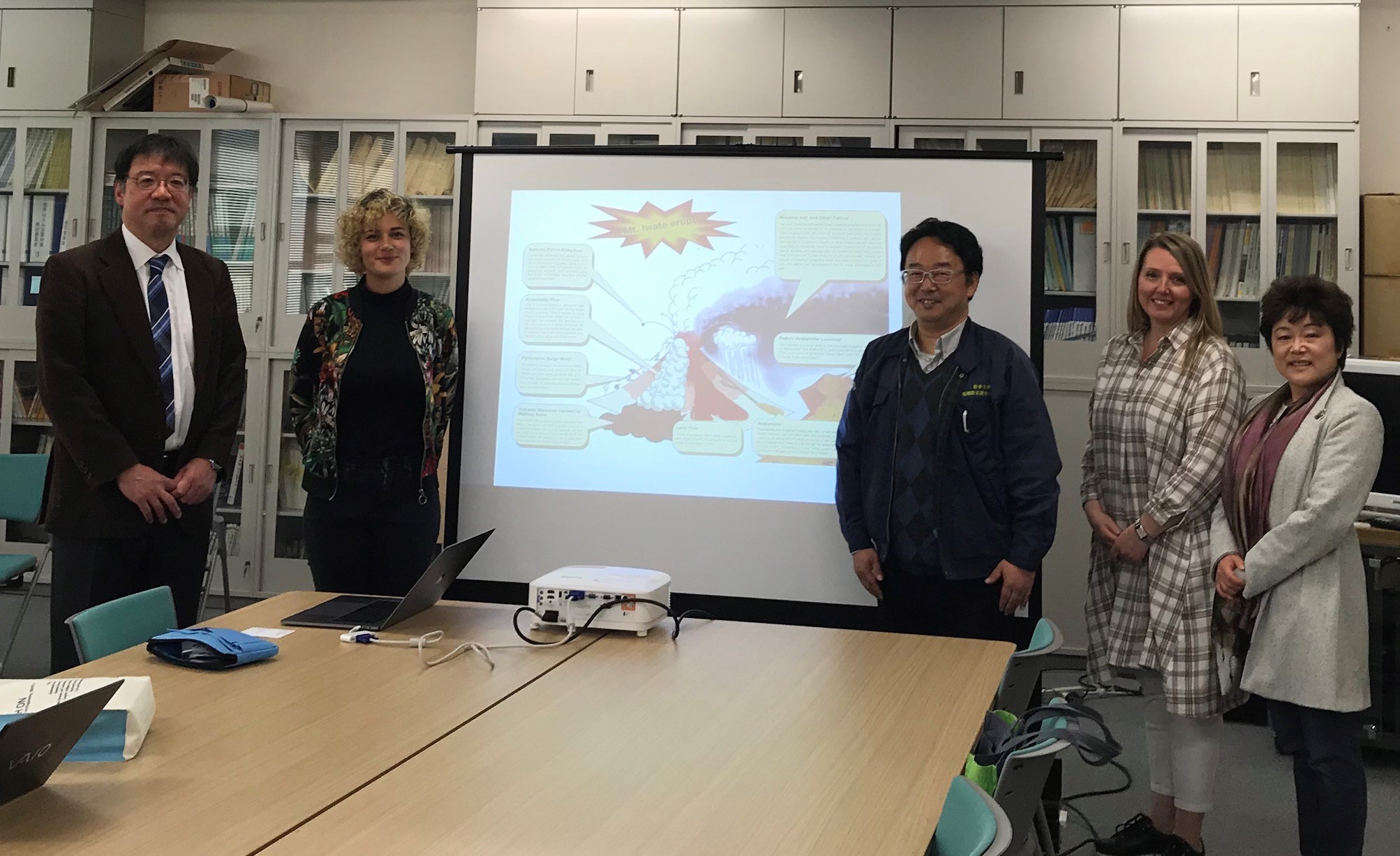 火山災害に関心のあるアイスランド大学の研究者であるDr. Uta Reichardt, PhD Candidate, Ingibjorg Lilja Omarsdottir (University of Iceland)が岩手大学に来訪され、岩手大学からは地域防災研究センター越谷信センター長と山本英和准教授が、グローバル教育センターから尾中夏美教授が対応しました。越谷センター長から、1998年岩手山の噴火危機および当時の火山防災対応について、岩手県における産官学連携による火山防災体制構築についてなどについて説明しました。アイスランドは火山国であり、Reichardtさん、Omarsdottirさん両者とも越谷先生の岩手山の話を興味深く聞いていただきました。たくさんの質問をいただき、終了予定時刻を過ぎてしまうほどでした。なお、今回のお二方の調査は、Watanabe Trust Fund研究助成金によるものです。