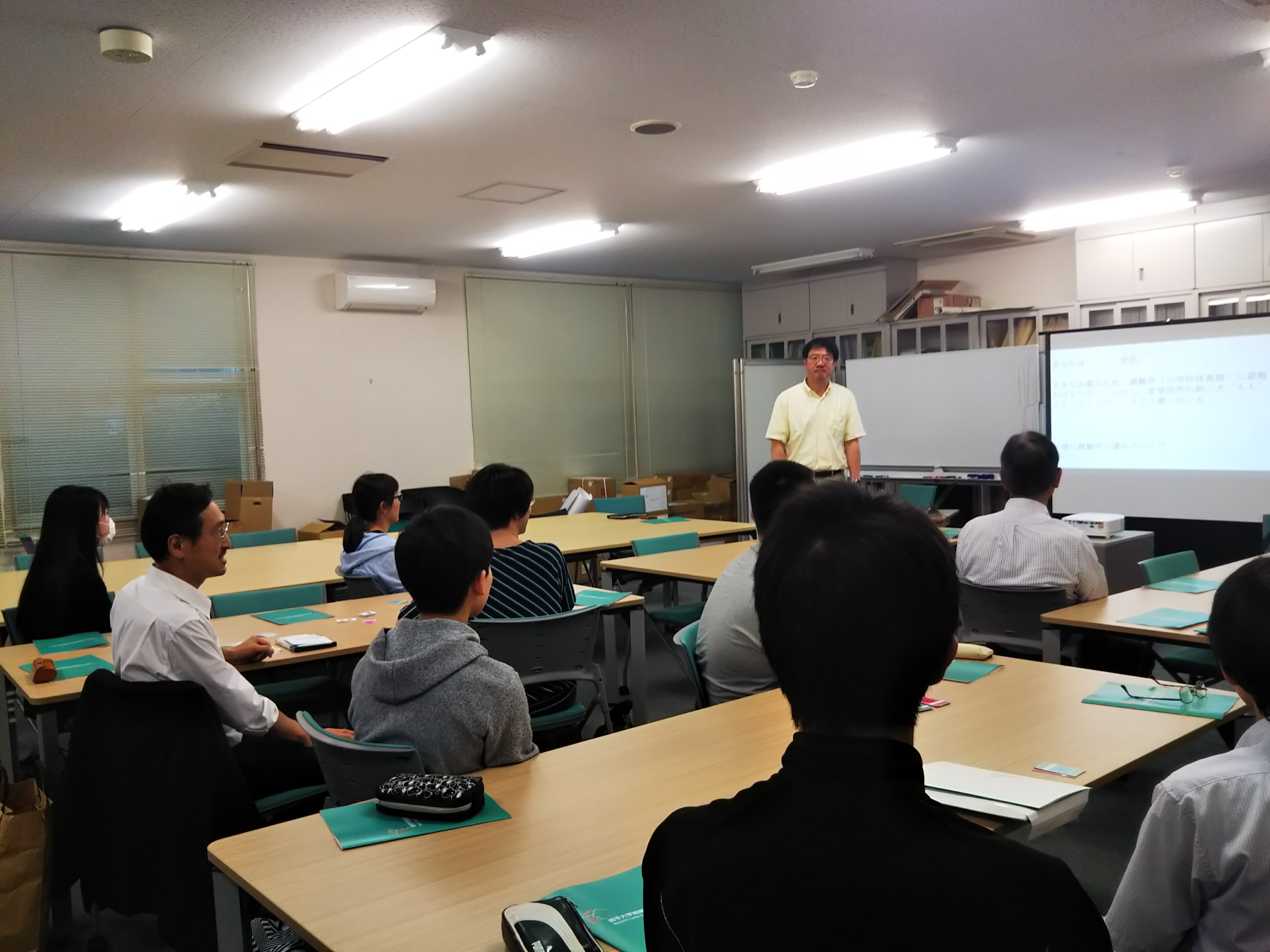 冒頭に、越谷センター長から、センターの研究活動や普及啓発の取組みなどの紹介があり、その後、3つのグループに分かれて、様々な災害時における状況を想定し、その時に求められる判断や行動、事前対策などについて考え、自分の考えをグループ内で表明・共有する「防災クロスロード(ゲーム)」を体験していただきました。短い時間での体験でしたが、生徒、教員の皆さんで混成されたグループの中では様々な判断や対応が示され、普段の生活では、あまりなじみのない災害時や避難所対応について考える機会となっていました。