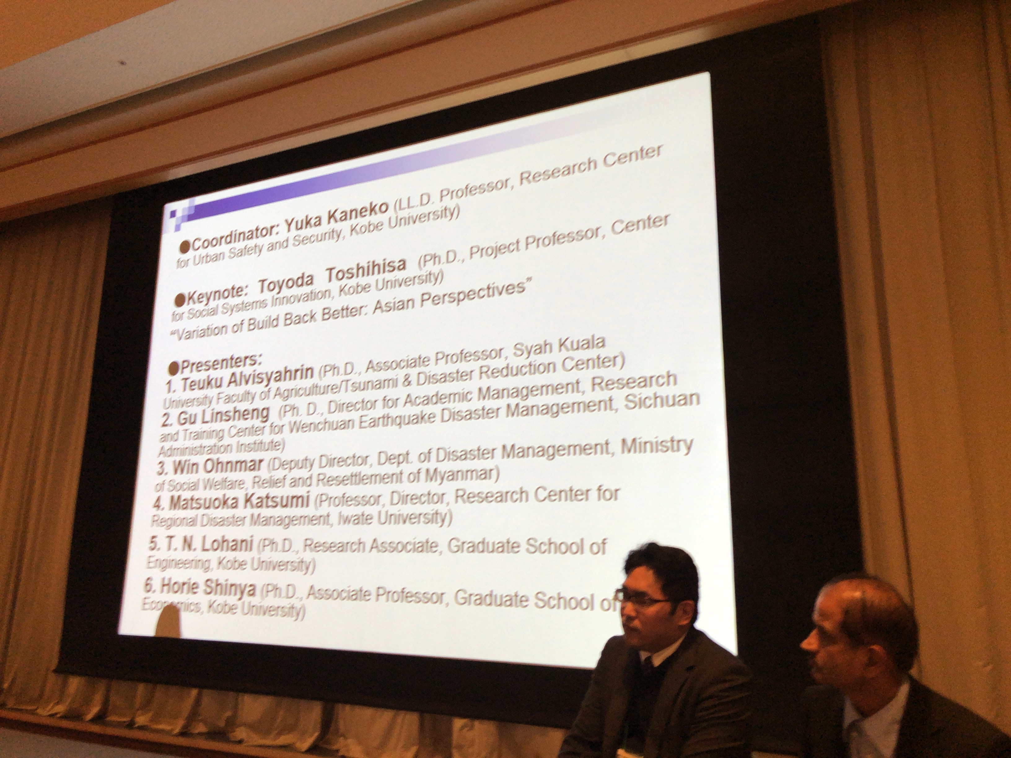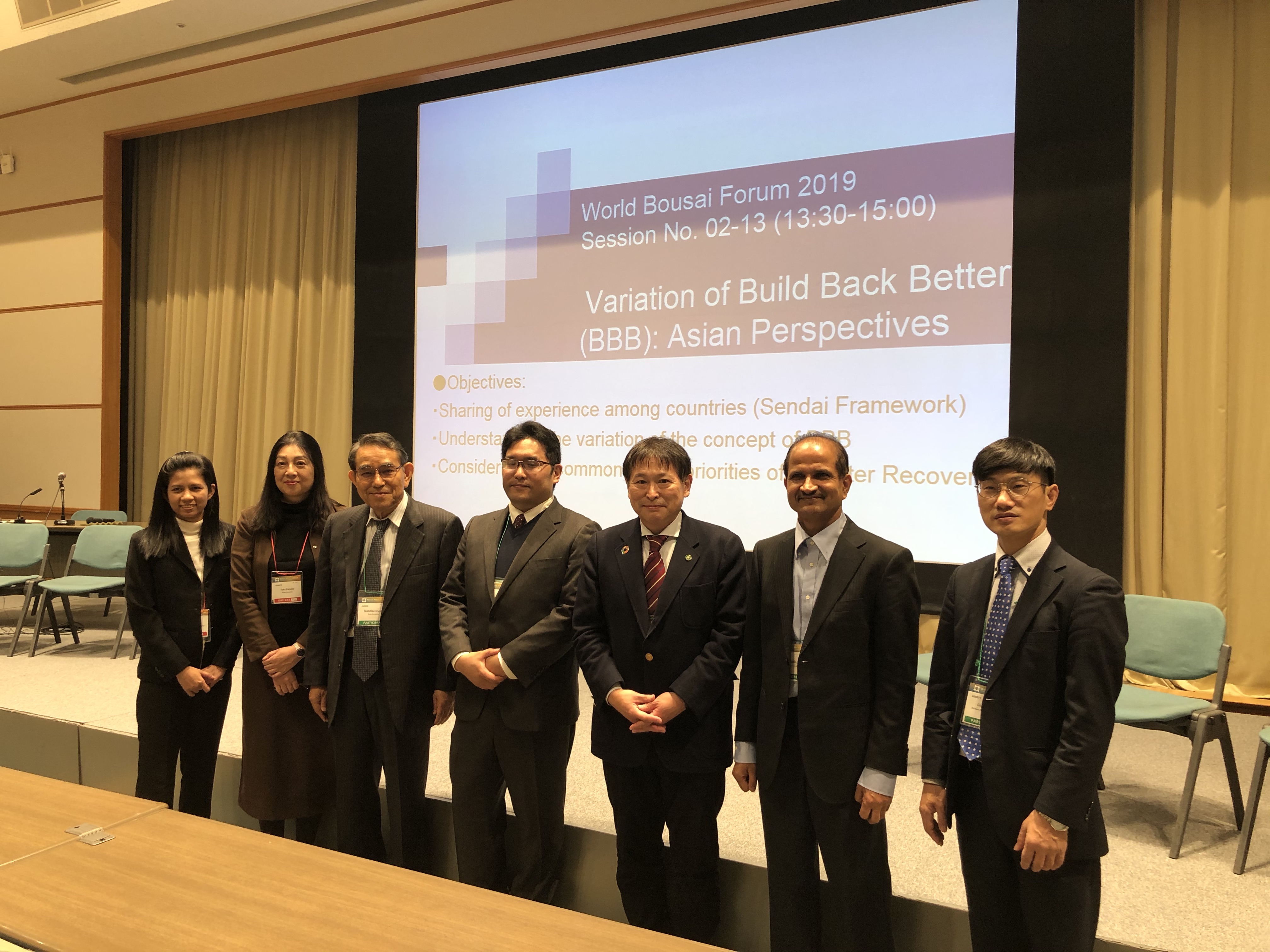 松岡勝実学長補佐(防災(国際連携)担当)が世界防災フォーラム/防災ダボス会議 @仙台2019に参加しました。この会議は、スイスの防災ダボス会議と連携し、国内外から防災関係者が集まる日本発(仙台発)の国際フォーラムです。松岡学長補佐は、神戸大主催のセッション、Variation of Build-Back-Better: Asian Perspectivesに招待され、「よりよき復興」の概念について、これまでの本学での活動や知見を踏まえて研究発表をしました。発表では、SDGsを目標にレジリエントなまちづくり、社会的な包摂性と結びついたBBB政策を展開し、グローカルな発信の重要性を強調しました。セッションの後半では、金子由芳神戸大教授(本学の地域防災研究センターの客員教授)がセッションの座長に着かれ、活発な議論が交わされました。