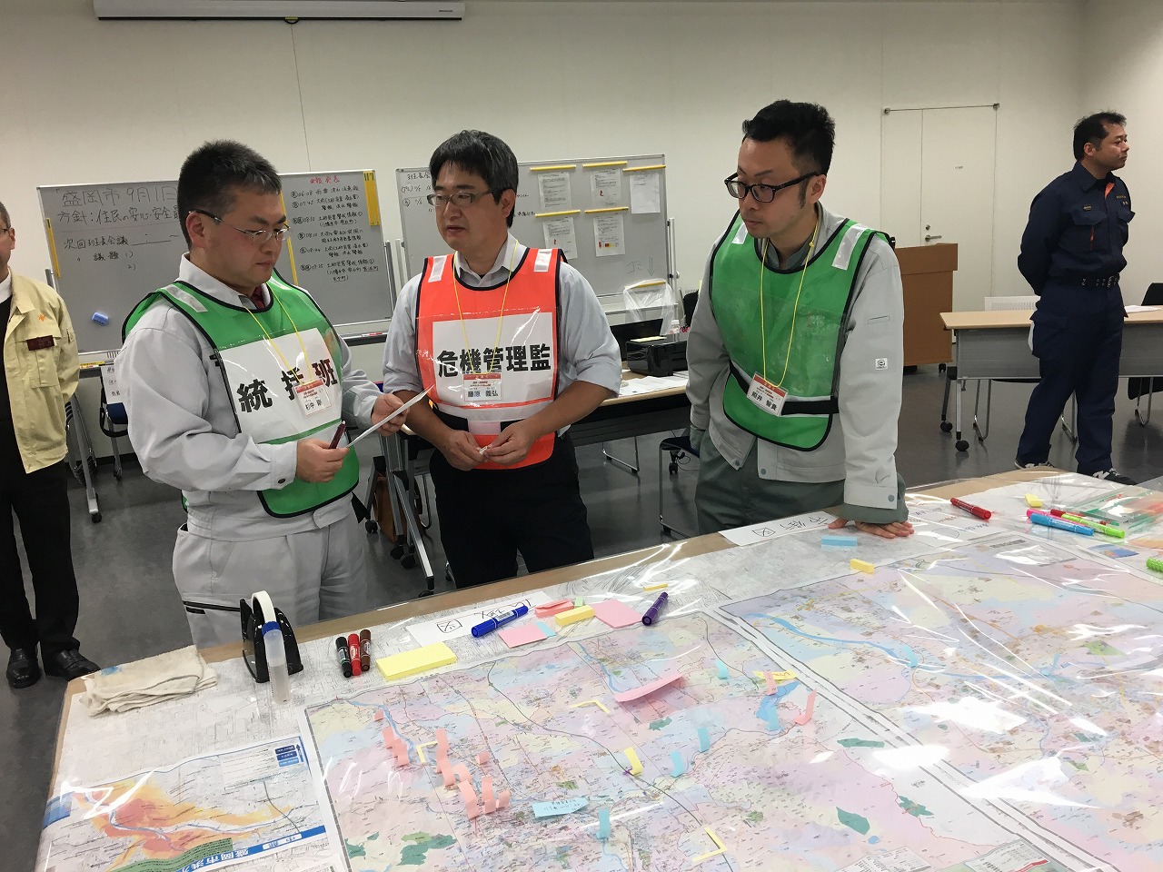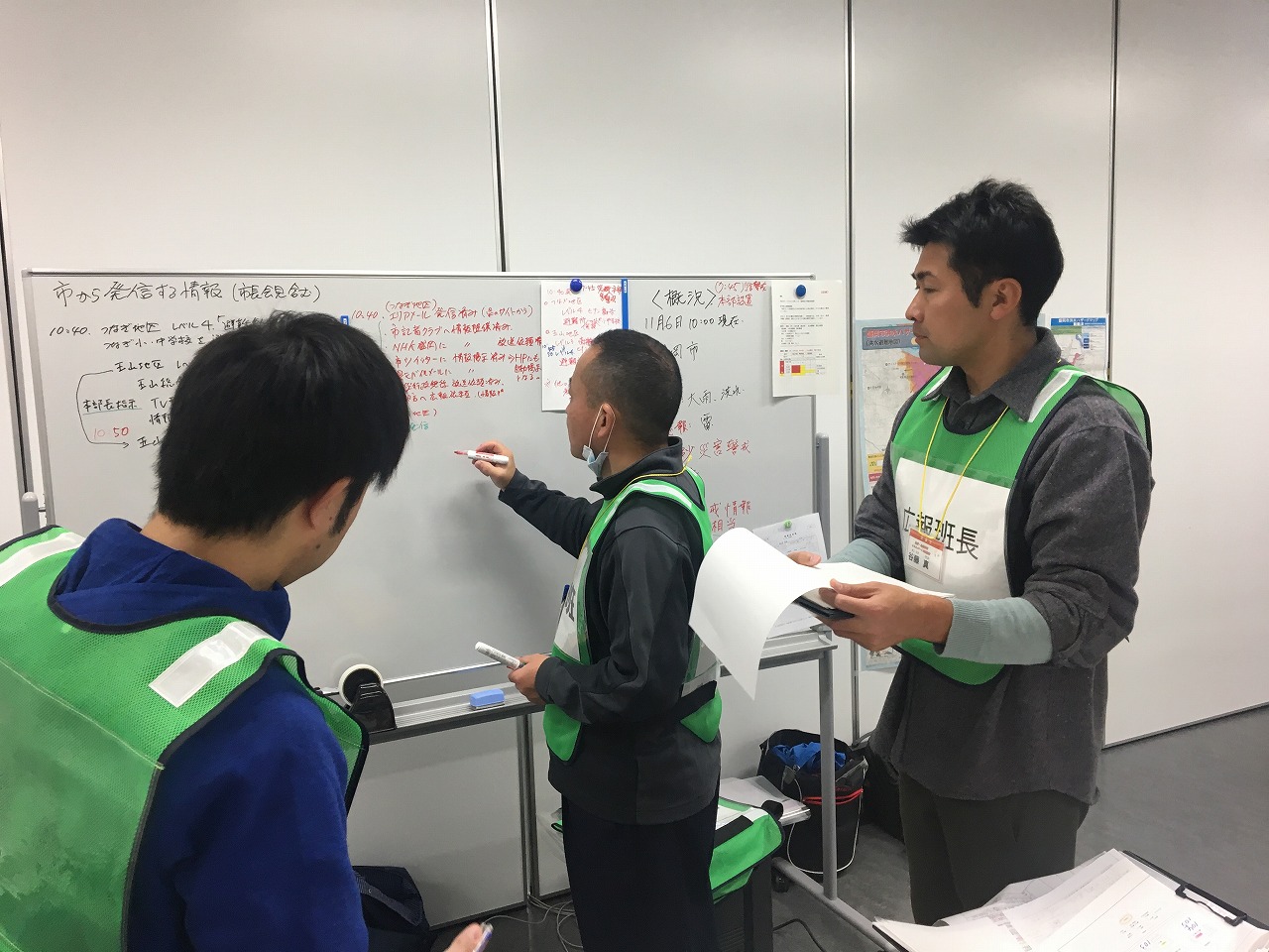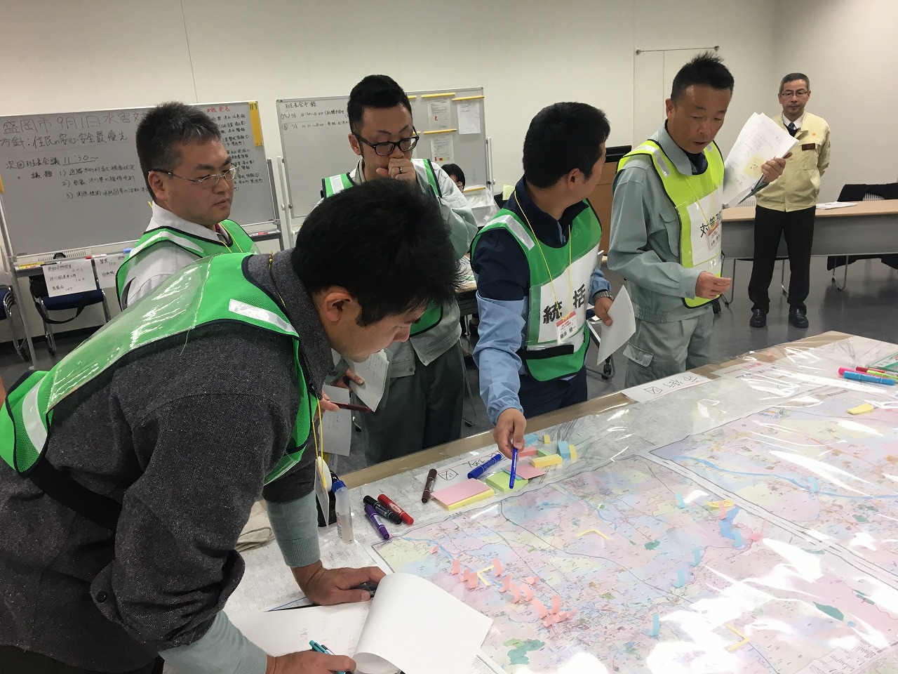 1日目は、はじめに越野客員教授による情報活動および意思決定のプロセスについての講義が行われました。午後からは盛岡市総務部危機管理課の進行で、図上訓練の進行方法や想定に関する説明が行われ、翌日からの本番に備えた準備・予行演習を行いました。