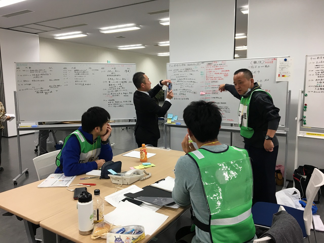 2日目は受講生により市災害対策本部事務局をそれぞれの活動に対応する機能班を編成し、地震災害を想定した実践的なロールプレイング方式の図上訓練を5時間にわたって実施しました。災害状況や市民からの問合せ、関係機関との連携情報などの状況付与を行うコントローラーは、岩手県総合防災室、盛岡市、自衛隊、盛岡消防本部、岩手県警本部、盛岡地方気象台から協力いただきました。また、訓練で使用した電話回線はNTT岩手支店に設置していただくなど、多くの機関からの協力を得ながら、より実際に近い状況のもとで災害対策本部の活動訓練が行われました。