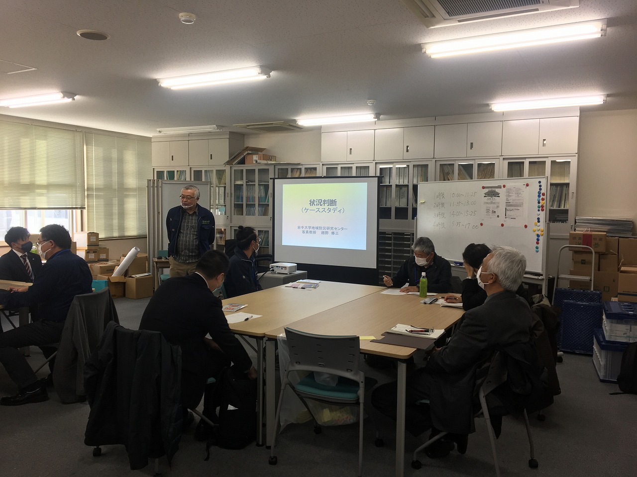 令和2年11月16日(月)~11月17日(火)の2日間、岩手大学地域防災研究センター会議室において、防災・危機管理エキスパート育成講座実習コースを開催しました。今回は新型コロナウィルス対策を万全に行った上での開催でしたが、受講者は、自治体職員、学校職員、一般の方など様々な分野から10名の参加がありました。