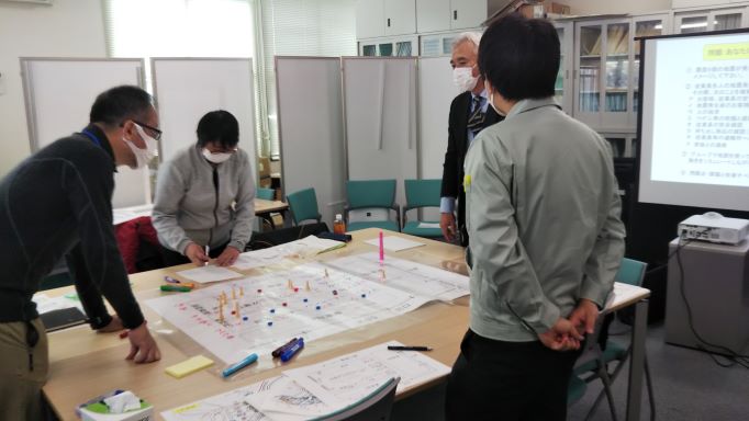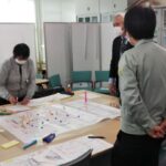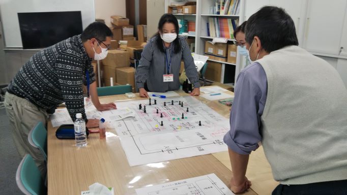 1日目午前中は,実習に先立ち図上訓練の手法とその目的,効果などの解説後、災害時のイメージアップと防災へのモチベーションの向上を図るクロスロードゲーム、午後には地域の災害特性とその対応策を検討するDIG(Disaster Imagenation Game,災害想像ゲーム)を行いました。