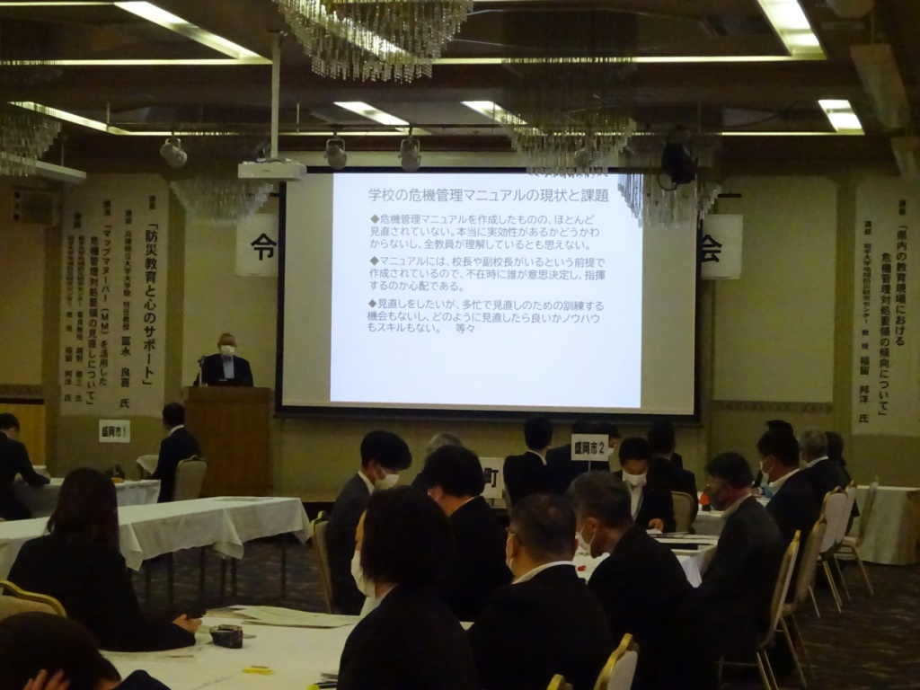 福留教授は、「県内の教育現場における危機管理対処要領の傾向について」として学校の危機管理マニュアルの現状と見直しの留意点、越野客員教授は「マップマヌーバー(MM)を活用した危機管理対処要領の見直しについて」という演題で、マップマヌーバーの概要やマップマヌーバーを活用するための状況判断の思考過程などについて解説を行いました。