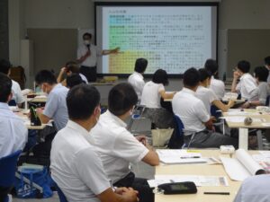 越谷教授による「岩手山の火山噴火の特徴と避難計画」についての講義を行った後、図上訓練(演習)を実施しました。図上訓練では、災害時の状況判断を学ぶ観点からクロスロードゲームの概要説明の後、火山噴火活動が活発化した際の警戒レベル引き上げに対する校長の状況判断について各グループで話し合いました。