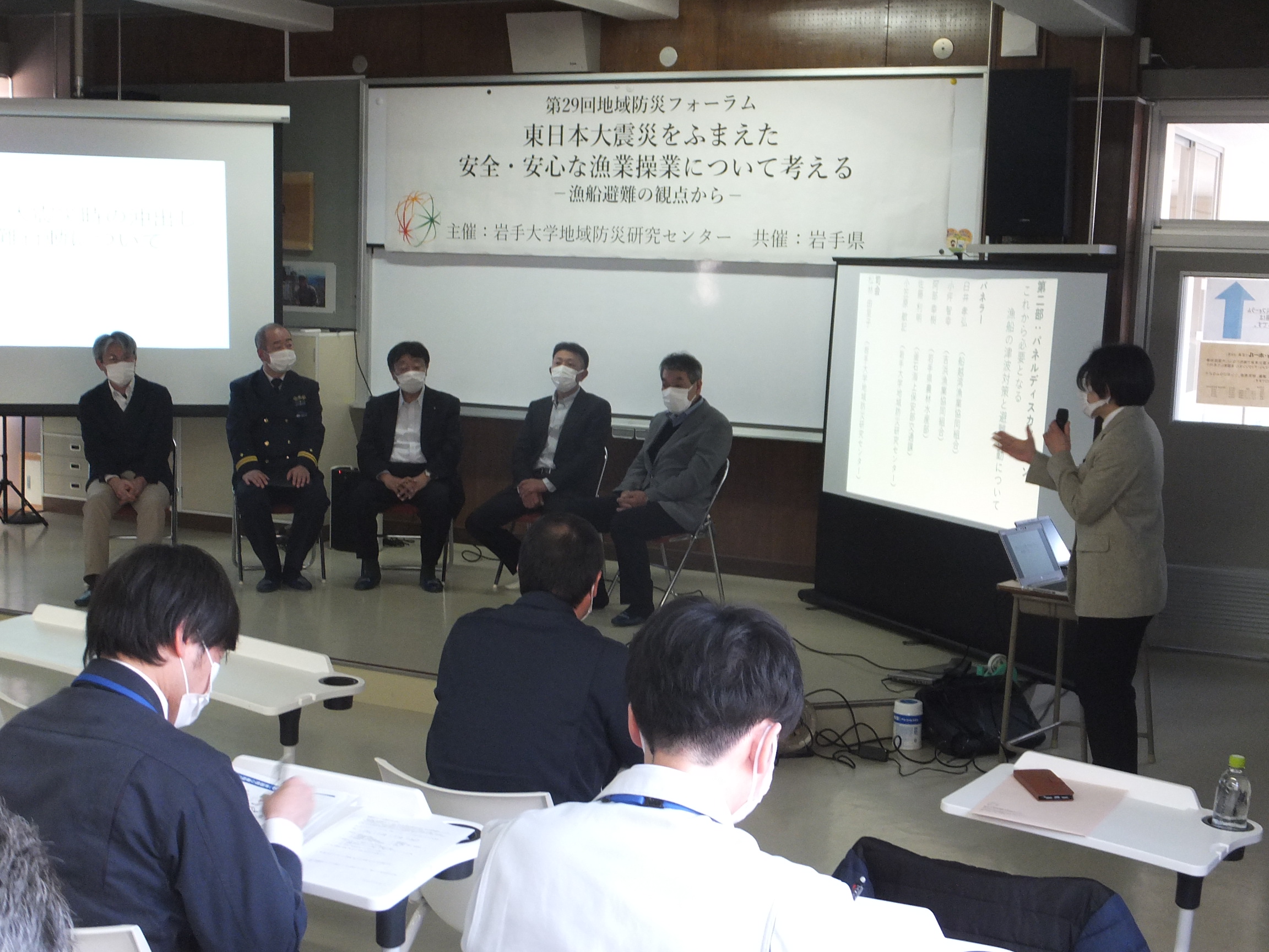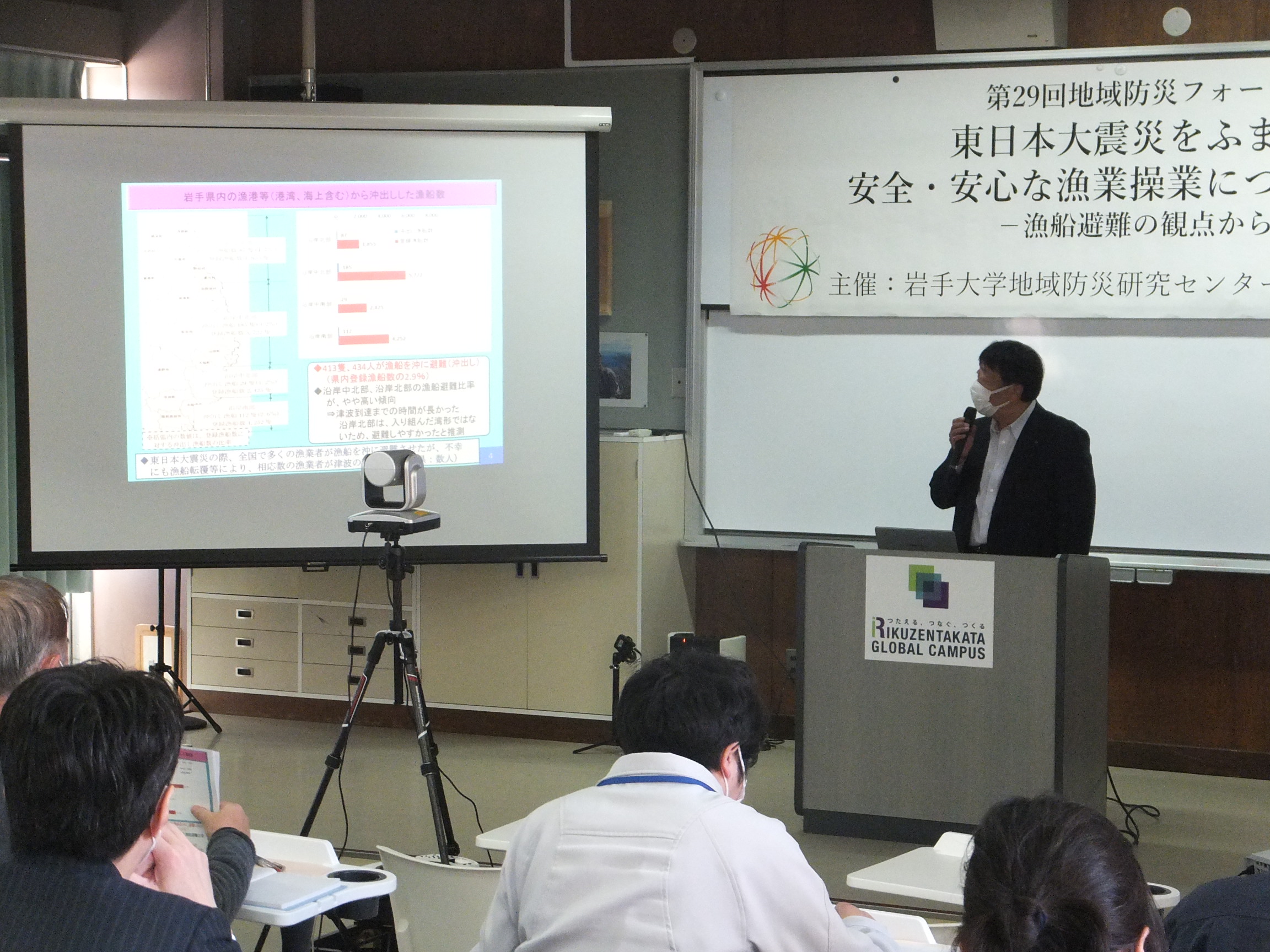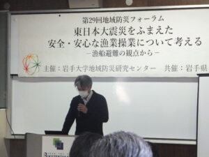 岩手県農林水産部漁港漁村課との共催で、第29回地域防災フォーラム「東日本大震災をふまえた安全・安心な漁業操業について考える-漁船避難の観点から-」を2023年3月8日(水曜)に陸前高田グローバルキャンパス(たかたのゆめキャンパス)のモンティ・ホールとオンライン配信において開催しました。