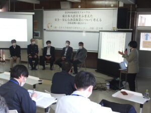 第二部のパネルディスカッションでは、松林由里子助教のコーディネートのもと、第一部の報告者3名に、吉浜漁業協同組合の小坪智幸さん、船越湾漁業協同組合の臼井孝弘さんも加わって進められました。二人の漁業者は東日本大震災発生当時の避難の様子を語られましたが、当時の天候、停泊していた港から沖出し(避難)しやすかったことなど偶発的な要素も影響していることが伺われました。