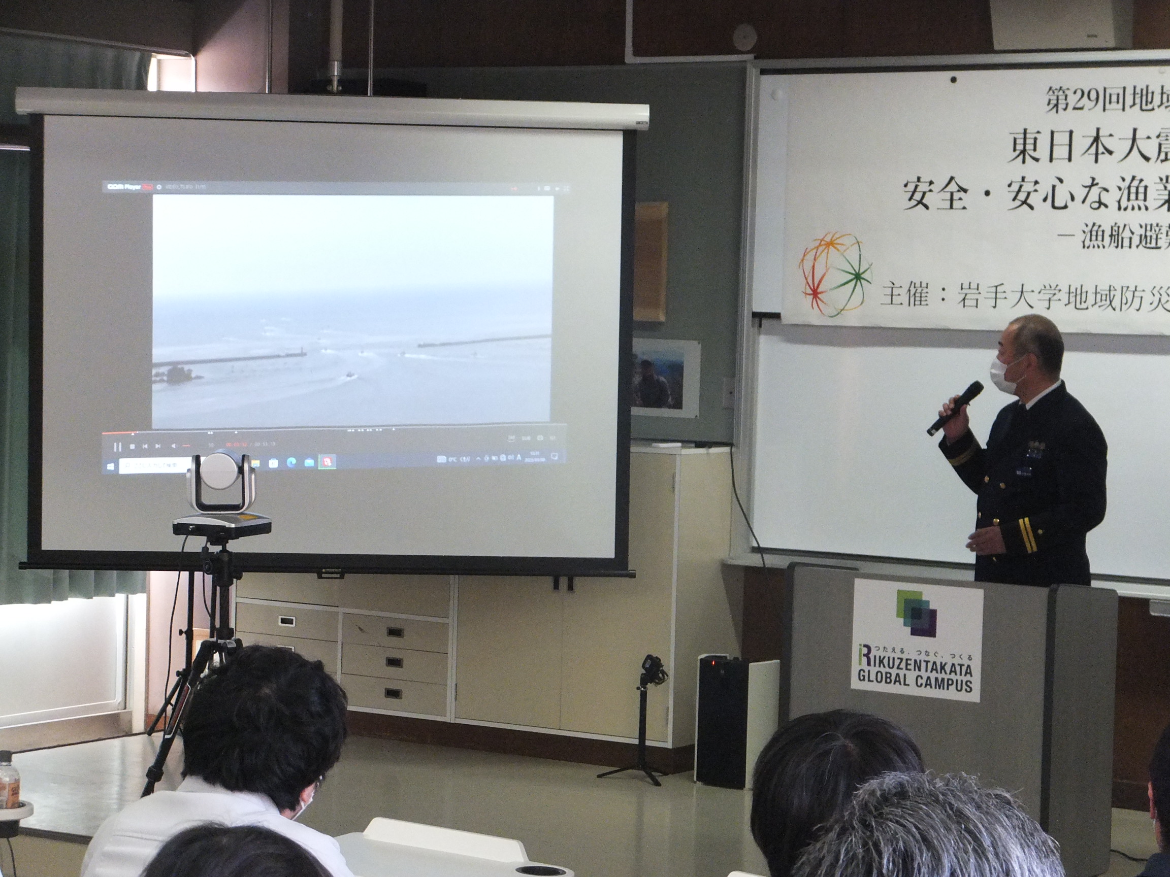 第一部では3名の識者からの報告が行われました。岩手県農林水産部の阿部幸樹参事からは、約60名の漁業者へのヒアリングを元にした東日本大震災における漁船避難の実態と,岩手県内の漁船避難ルール作成の取り組み、シミュレーションに基づく避難海域の検討や情報伝達の取り組みなどが紹介されました。釜石海上保安本部の佐藤利明専門官からは、(株)東海新報社発行の「鎮魂3.11」の動画を示しながら、大船渡湾口防波堤からの漁船避難について解説し、津波接近・来襲によって時々刻々と変化する状況の中で、沖出し避難することの危険を指摘されました。地域防災研究センターの小笠原敏記センター長からは、津波災害の概説とともに、今後想定される巨大津波(L2)の浸水想定図の捉え方について解説がありました。