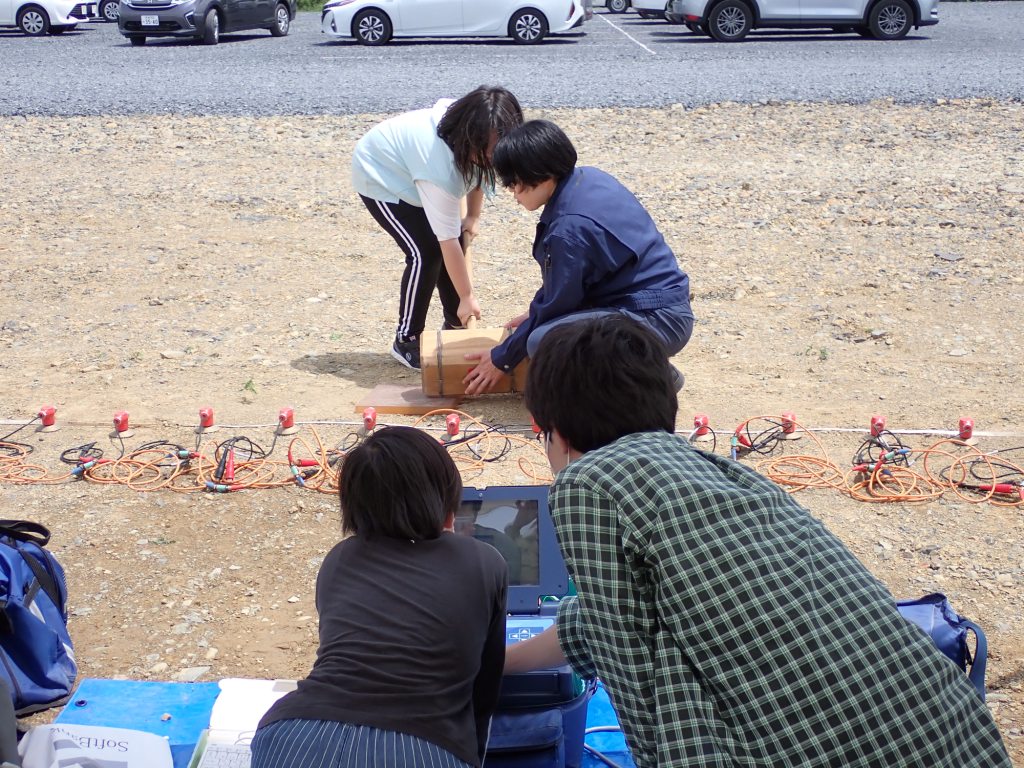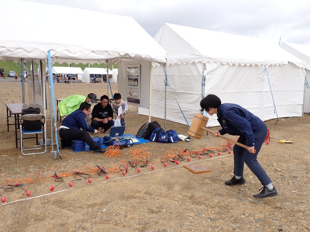 会場には多くの家族連れや演習に参加する消防団員が訪れ、表面波探査装置の実験(大型ハンマーによる振動の発生、揺れの確認)の体験や活断層地形のある地図の立体視などを行いました。