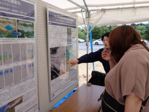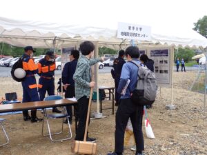 当日は、センターから山本英和准教授、松林由里子助教、福留邦洋教授が参加し、表面波探査装置の実演による揺れ(振動)の視覚的な確認、高密度アンケート調査による詳細震度分布(山本准教授)、北上低地西縁断層帯南部の活断層地形(岡田准教授)、流木の発生や堆積、氾濫被害拡大の事例紹介(松林助教)などに関するパネル展示を行いました。