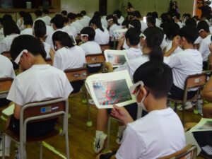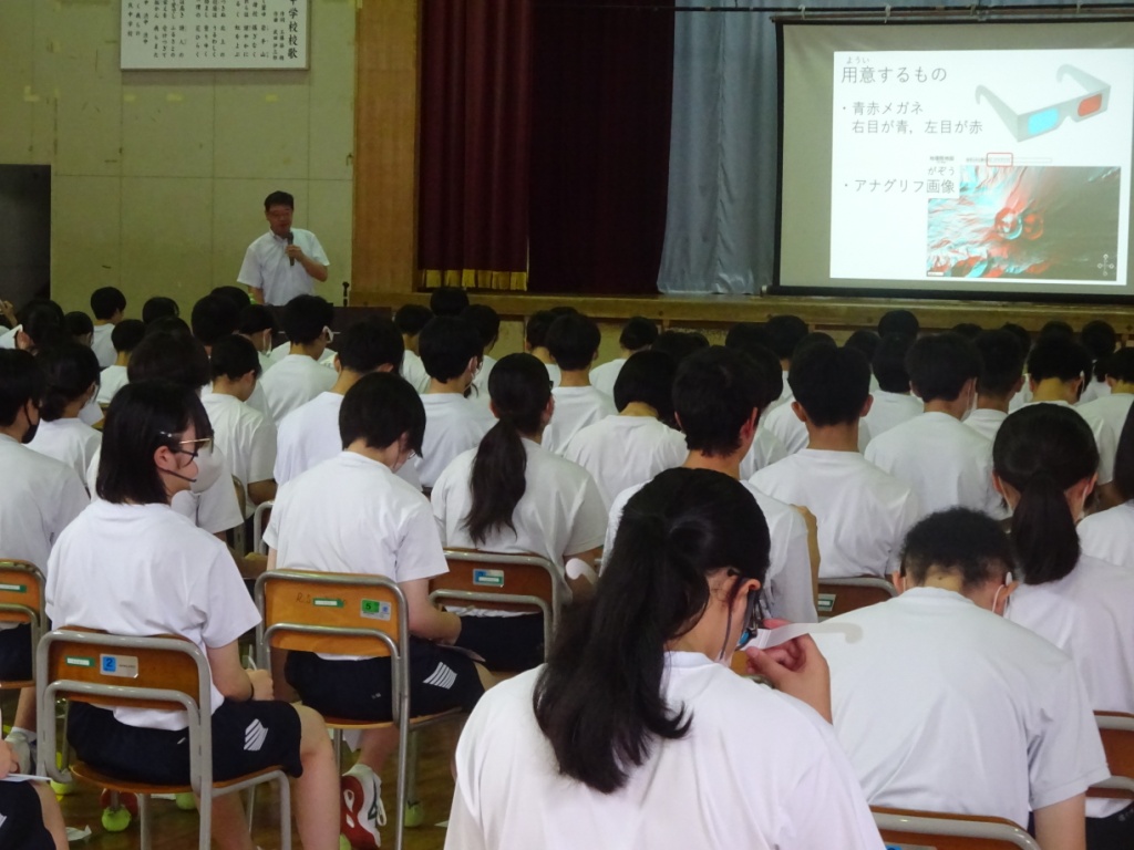 授業では最初に火山に関するクイズを問いかけ、噴火のしくみについて実験動画とスライドで説明を行いました。その後、岩手山火口の地形を立体視するため、中学生は赤青メガネ(立体視メガネ)をかけて確認しました。また、噴石や火山灰など空から降ってくるもの、火砕流や溶岩流、土石流や融雪型火山泥流など地面の上を流れるものなど火山の噴火現象について解説しました。そして、噴火する前の準備や情報収集の重要性について指摘しました。生徒からはどんなものを準備する必要があるのか、噴火の前ぶれをどのように把握すればよいのかなど活発な質問がありました。