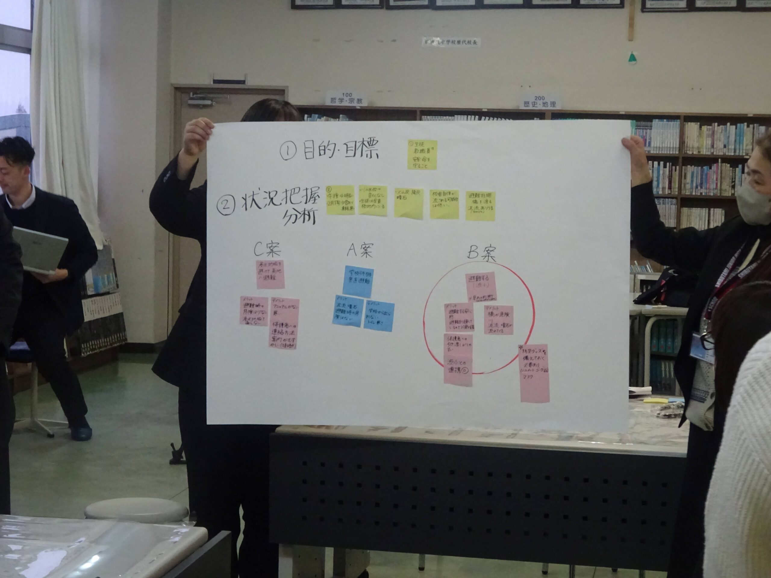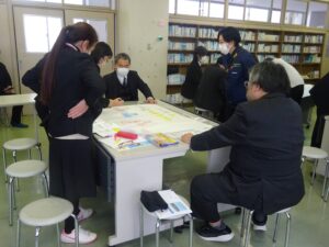 教職員16名は3グループに分かれて授業中に噴火警戒レベル3が5へ引き上げられた際、学校長の立場としてどのように状況判断するか目的・目標の確立、状況把握、対策案の分析、比較などについて話し合いました。参加者からは中学校周辺の地形等地域環境をふまえた判断が提案されるなど具体的な検討が展開され、現場の教員、自分事として捉えていることが伝わる研修会でした。