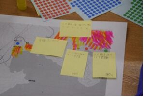 その後、唐丹中学校学区の白地図に生徒たちの自宅から指定避難所(唐丹小学校)までの避難経路を記入し、ひもを使って道のりを測り、避難に要する時間を算出しました。また、釜石市ハザードマップに示されている警戒区域に重なる場所をチェックし、自分たちの避難経路にはどんな危険個所があるかを調べる演習を行いました。