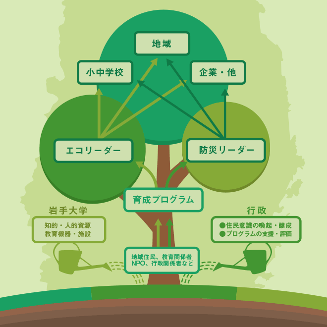 このプログラムでは、環境問題や地域防災活動の重要性を地域、学校、職場などへ伝え、そこでの活動を牽引するリーダーを育成することを目的として、「エコリーダー育成コース」と「防災リーダー育成コース」の2コースを設けています。